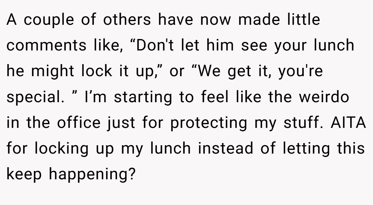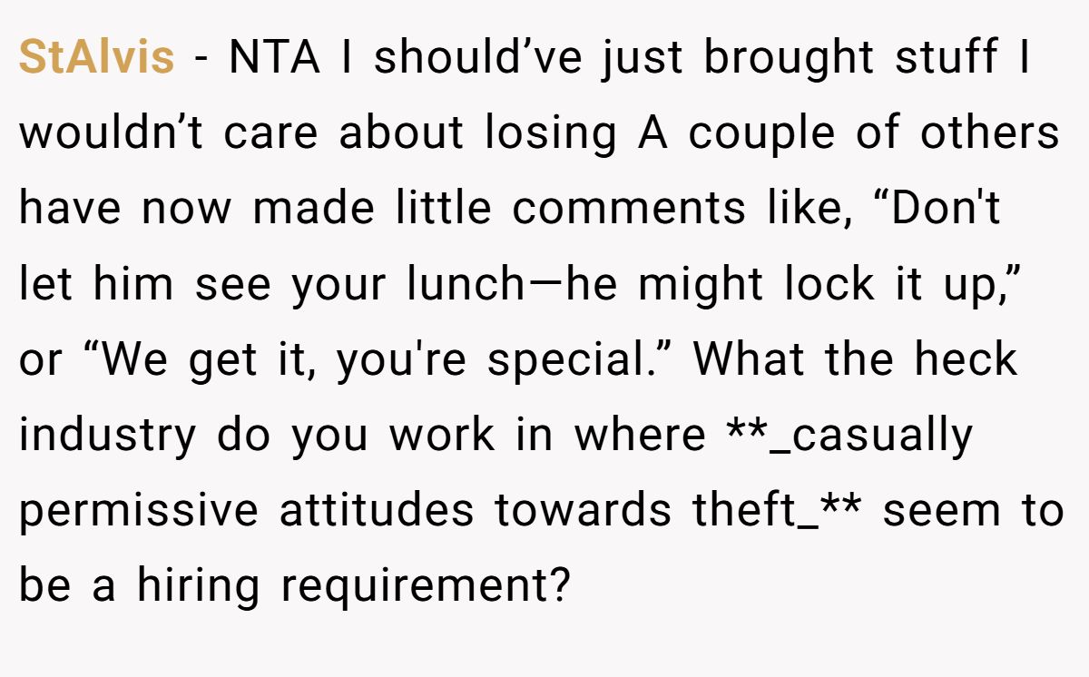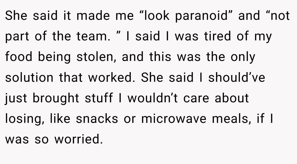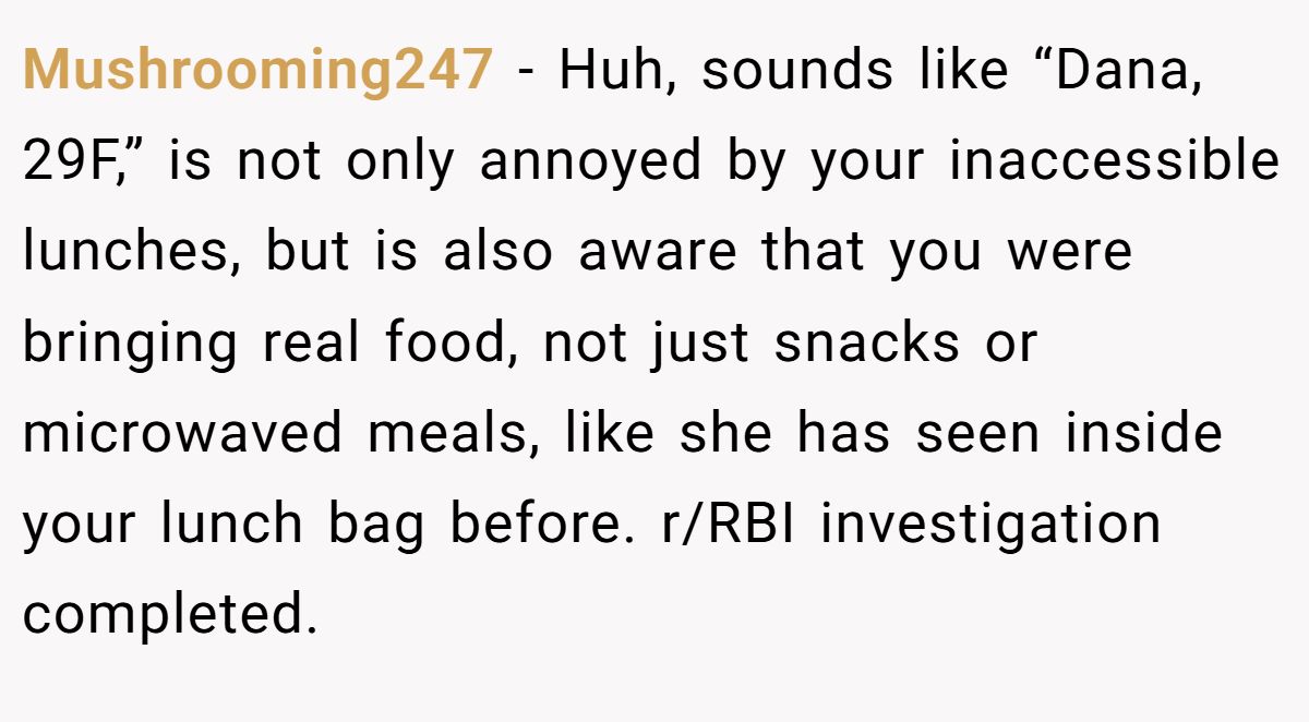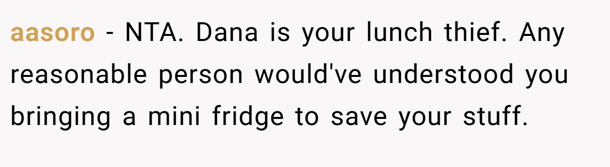 Nothing ruins a workday like a stolen lunch, and this Redditor’s saga of vanishing meals is a workplace whodunit. After losing five homemade dishes in a month, he invested in a mini fridge with a lock, only to have coworker Dana label him “paranoid” and “not a team player.” Her pushback, plus snide remarks from others, suggests more than just office banter—could Dana be the hungry culprit, or is this just petty workplace politics?