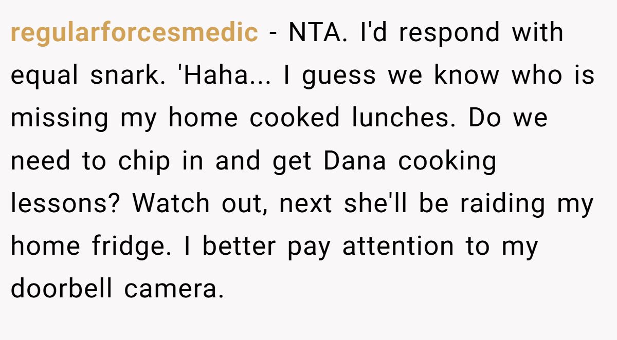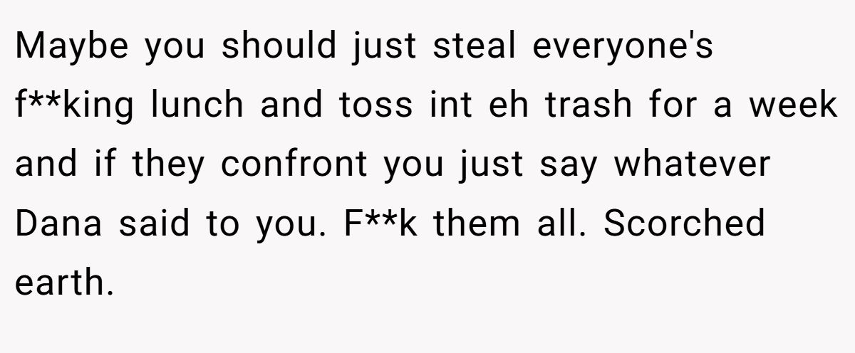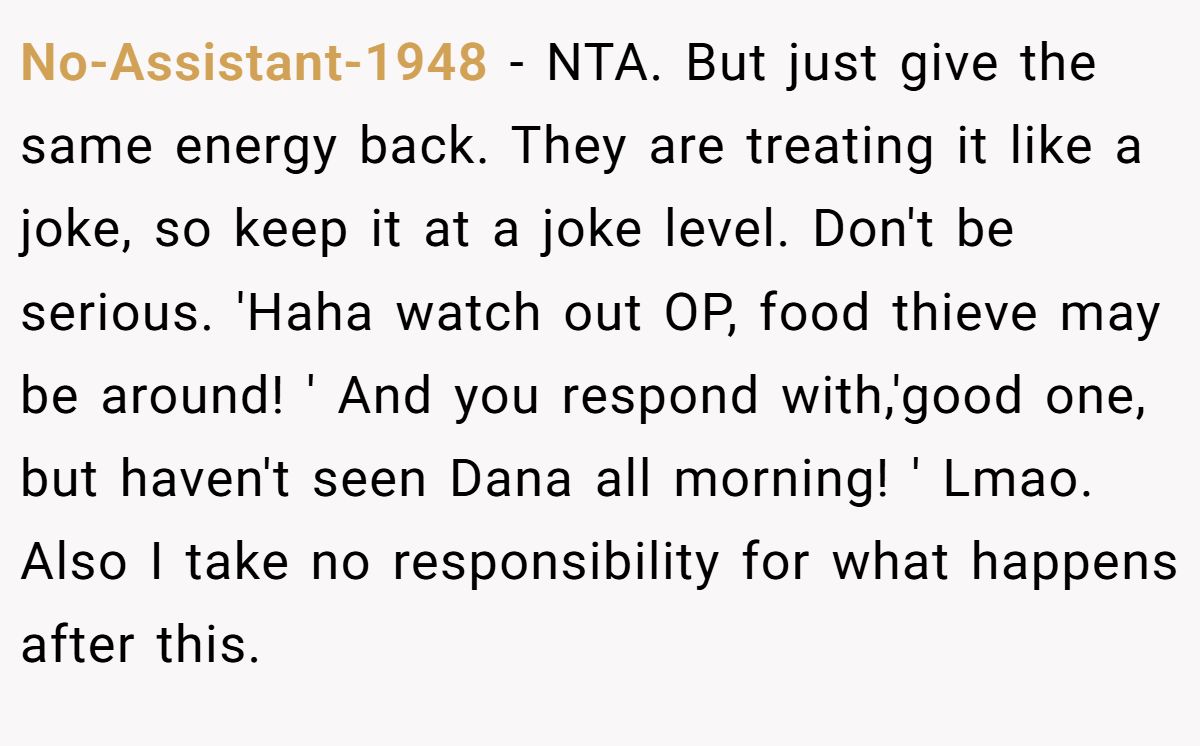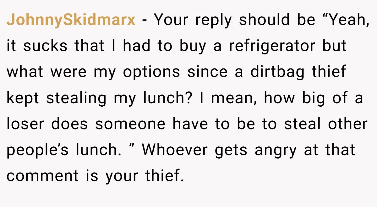 Dana’s comments and the group’s teasing suggest a clique-y dynamic, where conformity trumps fairness. The Redditor’s lock isn’t just about lunch—it’s about asserting control in an environment where his boundaries were ignored. Neutral advice? Keep the fridge, ignore the snark, and consider a polite chat with the boss about workplace respect. If Dana’s the thief, her discomfort speaks volumes. What do you think—is he justified, or did he stir the pot too much?
