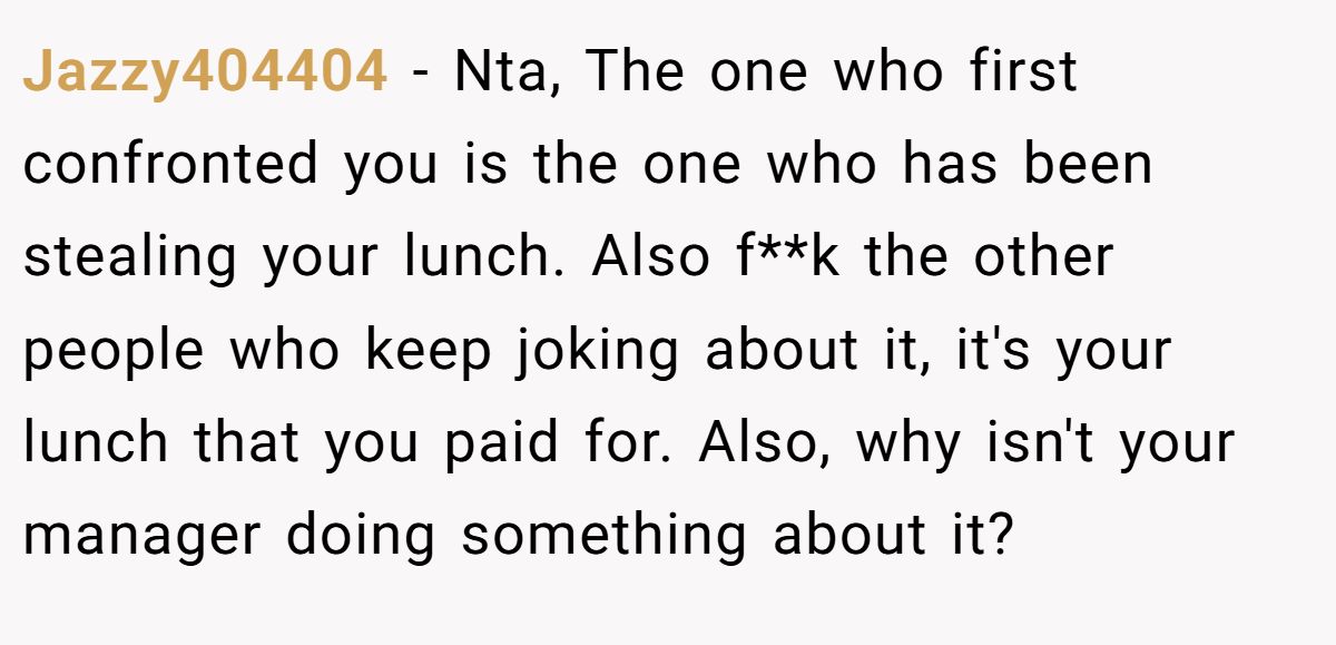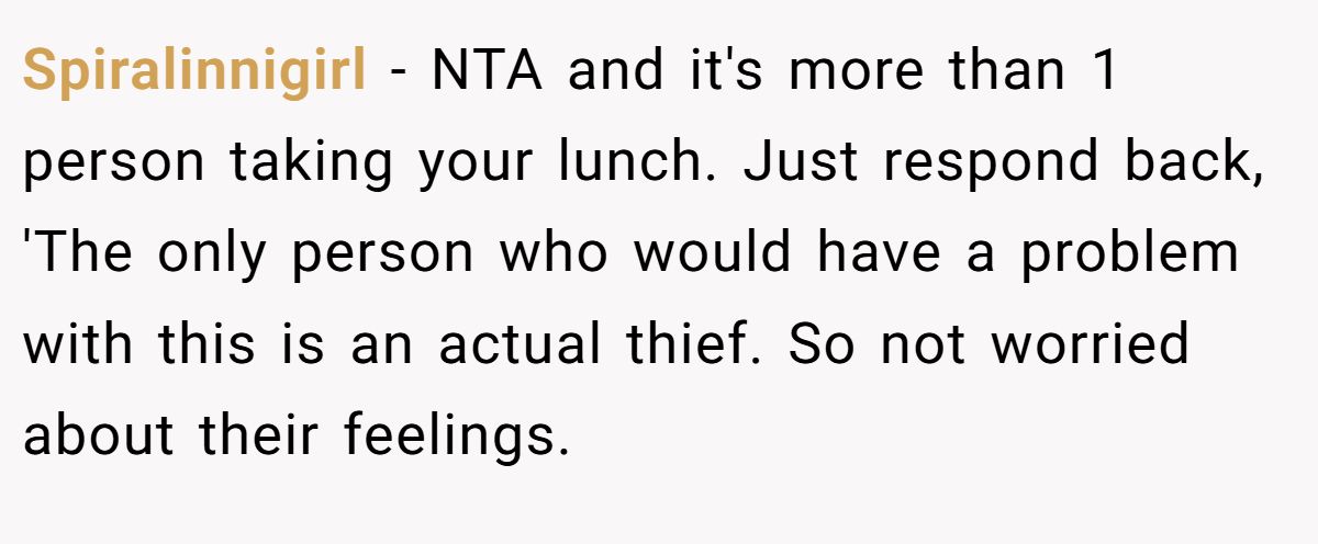 Workplace theft, even of something as “small” as lunch, erodes trust. Dr. Pamela Rutledge, a workplace psychologist, notes in a 2022 Forbes article, “Small violations, like taking someone’s food, signal a lack of respect and can destabilize team dynamics”. Dana’s suggestion that the Redditor bring “less desirable” snacks implies she sees his food as fair game, a mindset that dismisses personal boundaries. Her public confrontation also hints at deflecting guilt, as several Redditors suspected.