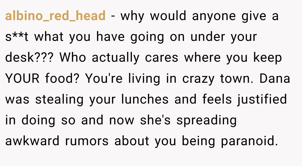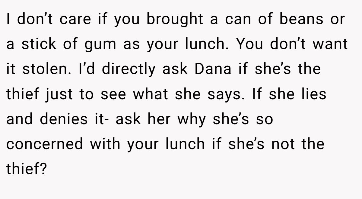 Reddit’s lunch detectives smelled a rat, pointing fingers at Dana and slamming the office’s casual attitude toward theft. Here’s what the community dished out: