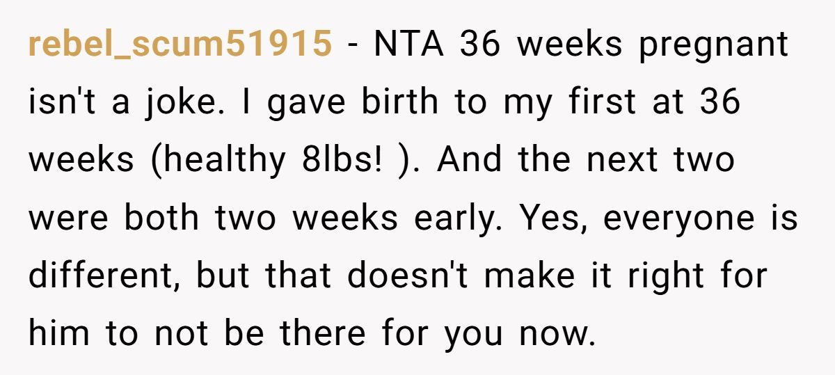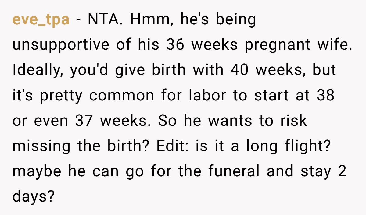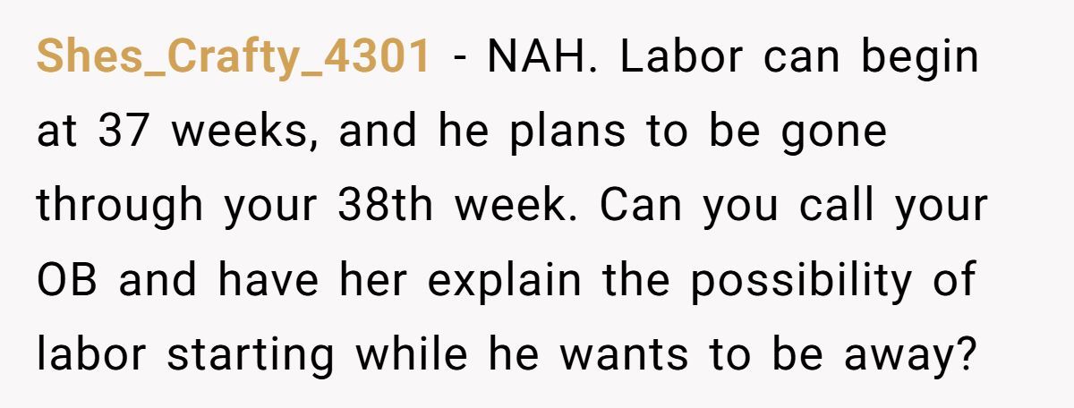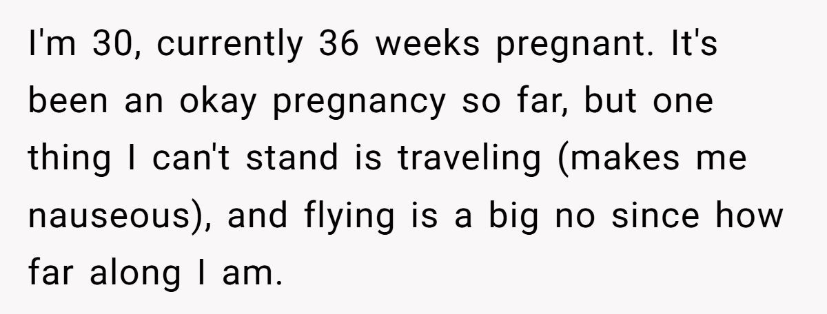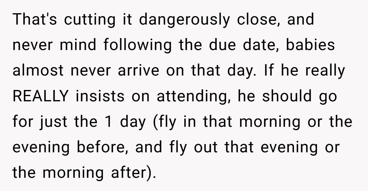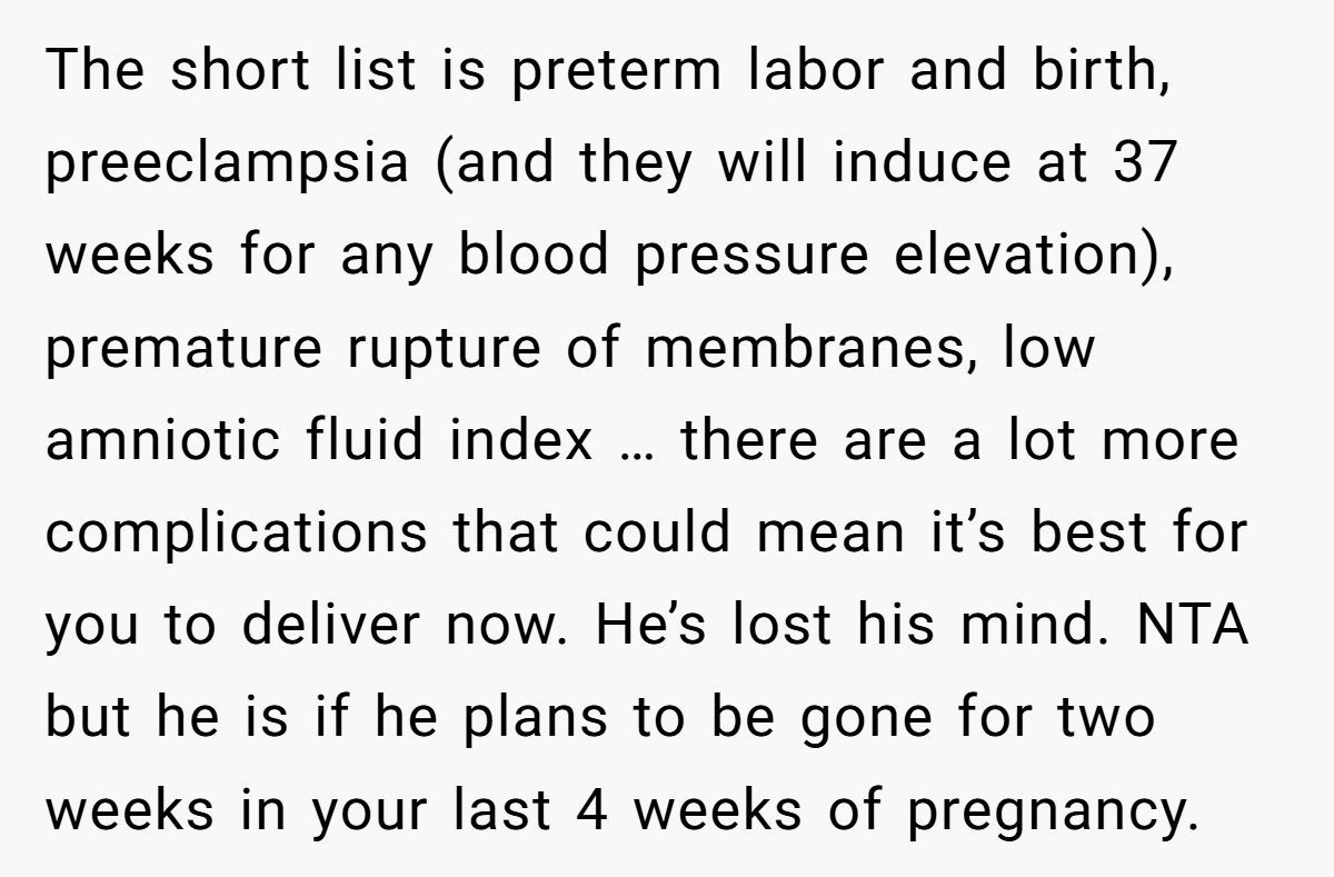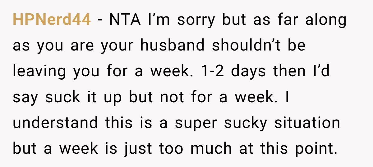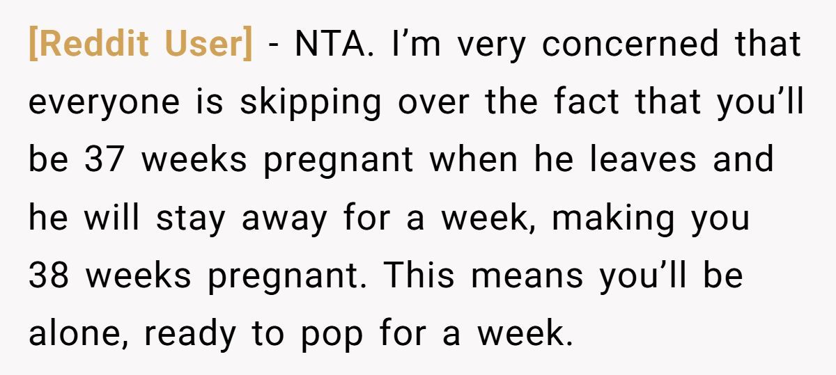 A Reddit user is 36 weeks pregnant, exhausted, and dealing with nausea that makes even car rides miserable. But that’s not the biggest issue she’s facing. Her husband is planning to fly across state lines—for an entire week—right before she’s due to give birth. And when she asked him to stay, he called her unsupportive.