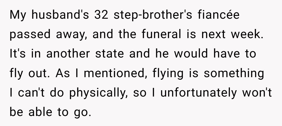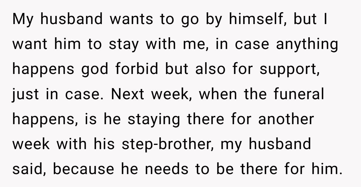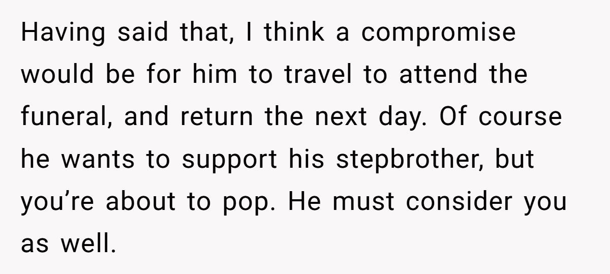 Her husband’s stepbrother recently lost his fiancée, and the funeral is just days away. He says he needs to be there. But she’s about to hit full term. Shouldn’t he be by her side, just in case the baby arrives early?