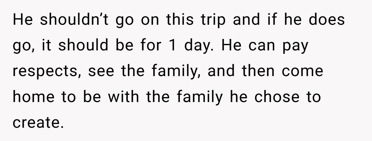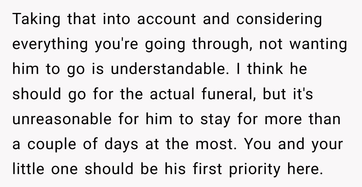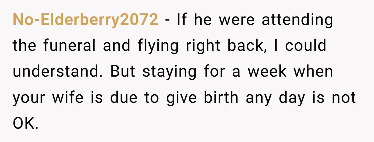Many commenters agreed: attending the funeral is understandable, but staying an entire week? That’s where empathy begins to shift. It’s not just about emotional support for his brother—it’s about responsibility to his wife and unborn child.
