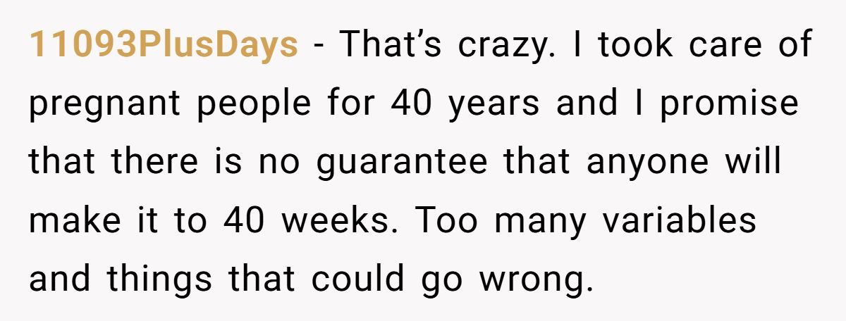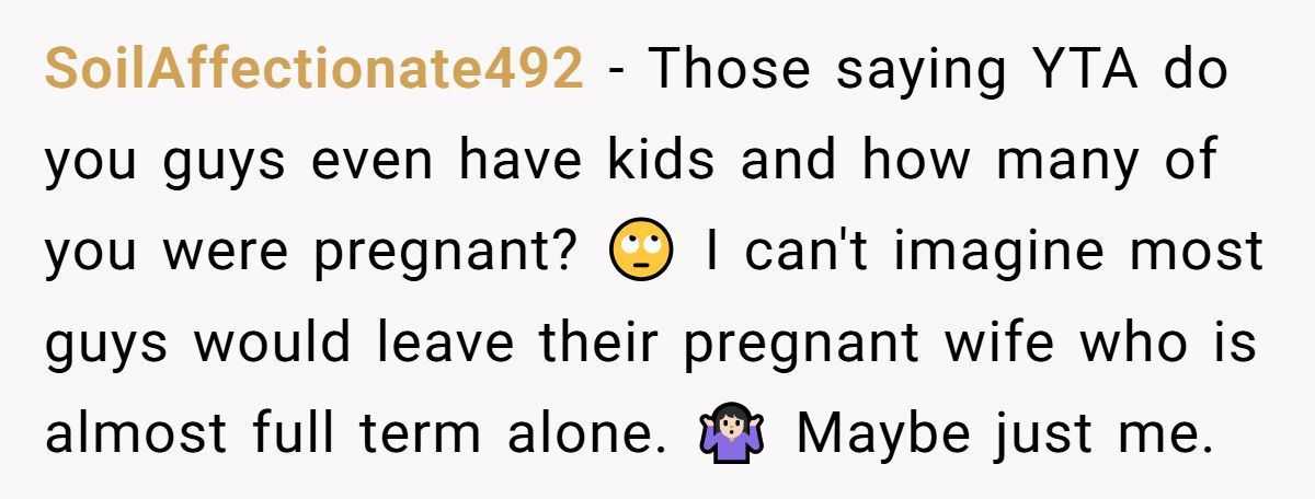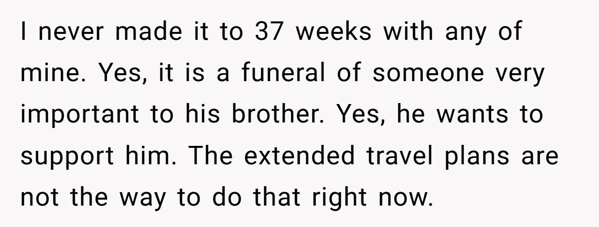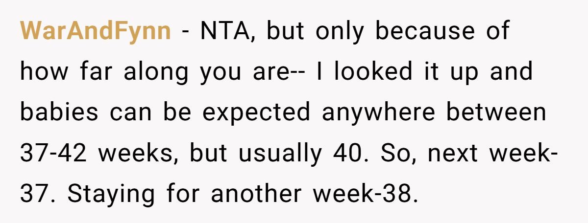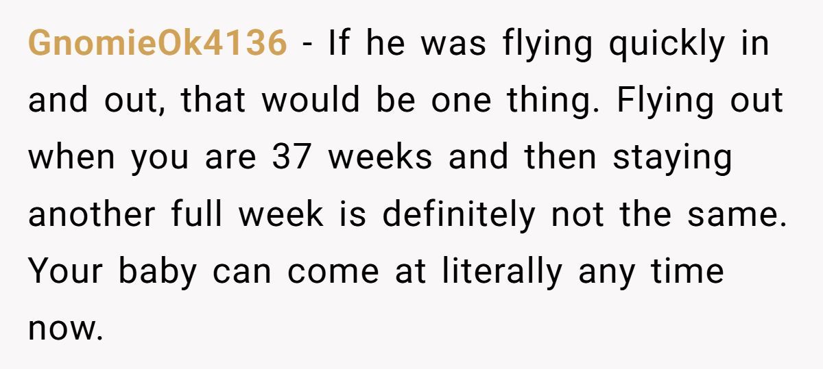 These Redditors supported OP, arguing a week-long trip at 37-38 weeks risks missing labor or complications, urging a shorter visit