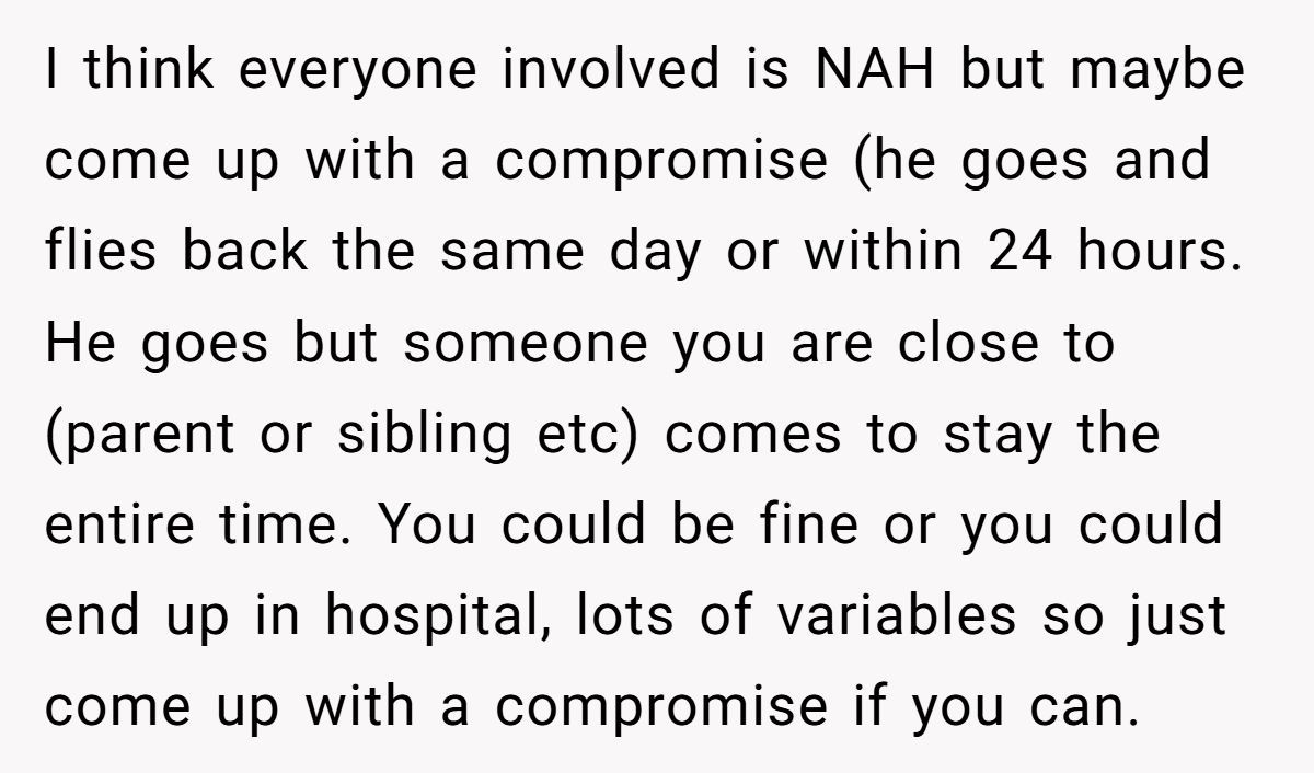 Is she unsupportive—or is he overlooking the urgency of her situation? Would a compromise solve everything, or are some moments simply too delicate for negotiation? What do you think? Should he go or stay? Drop your take below—we’re all ears.