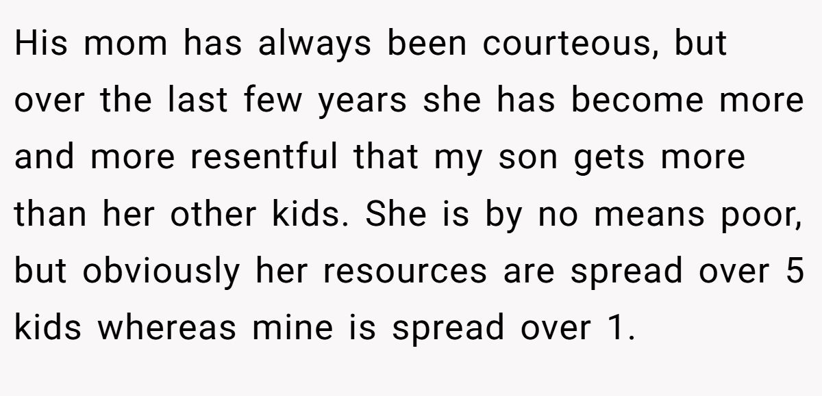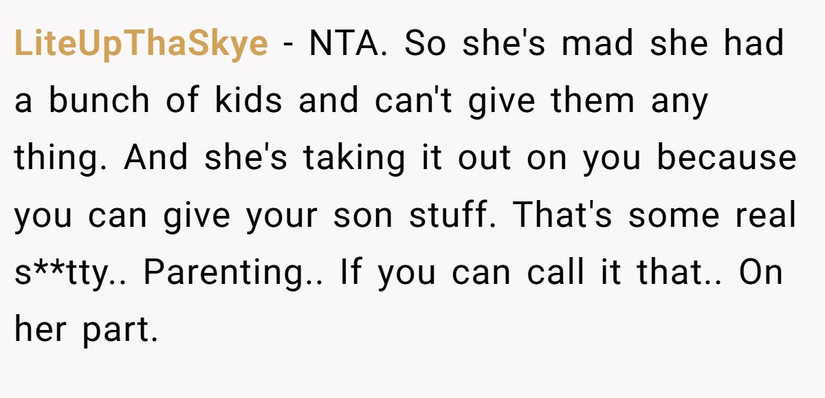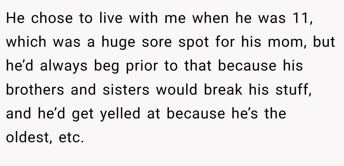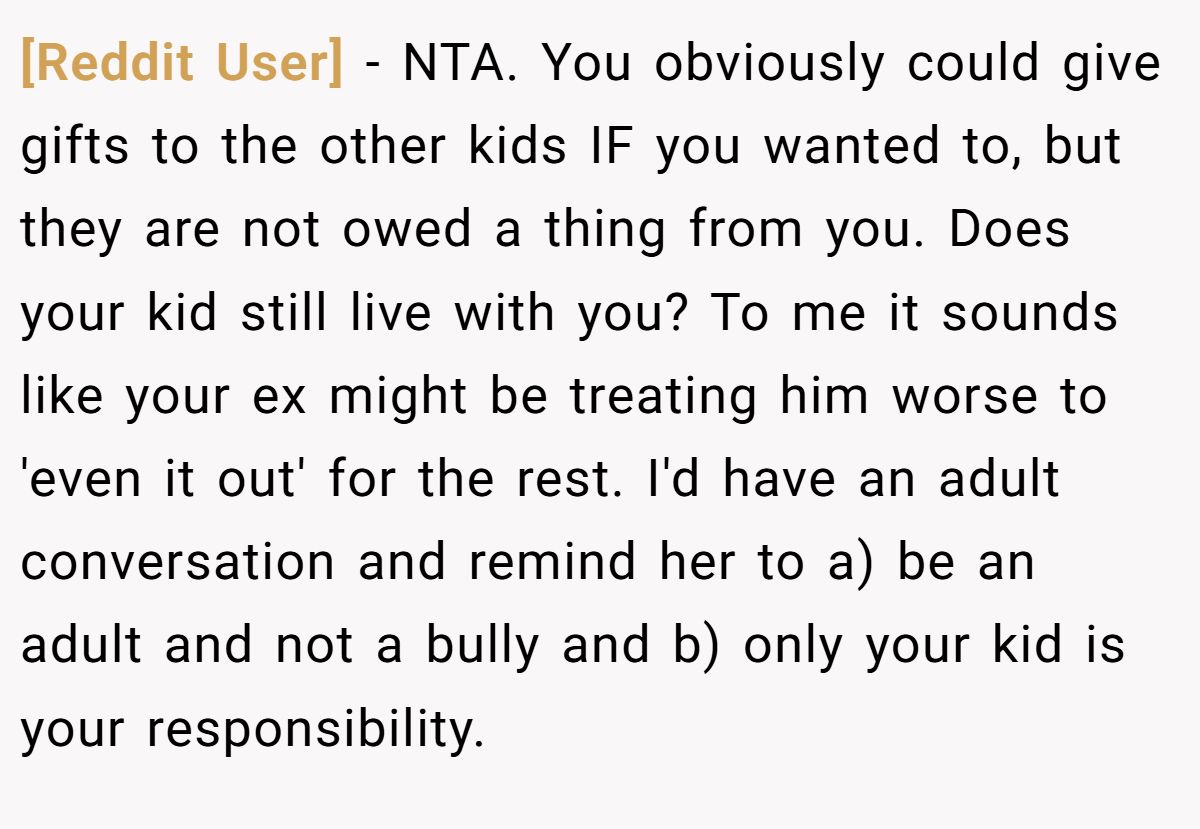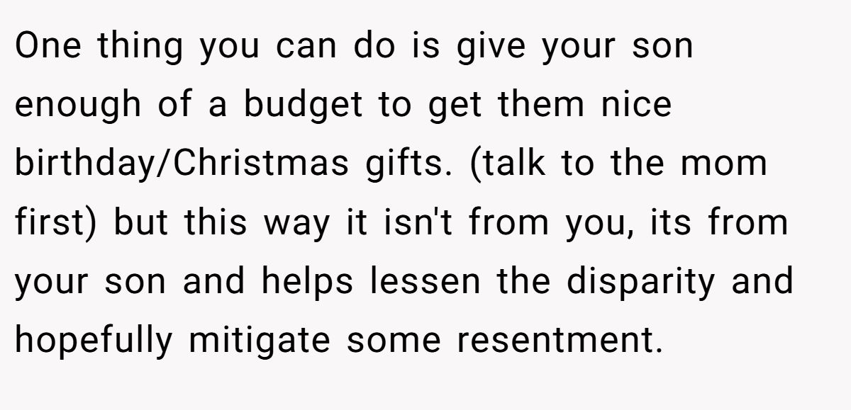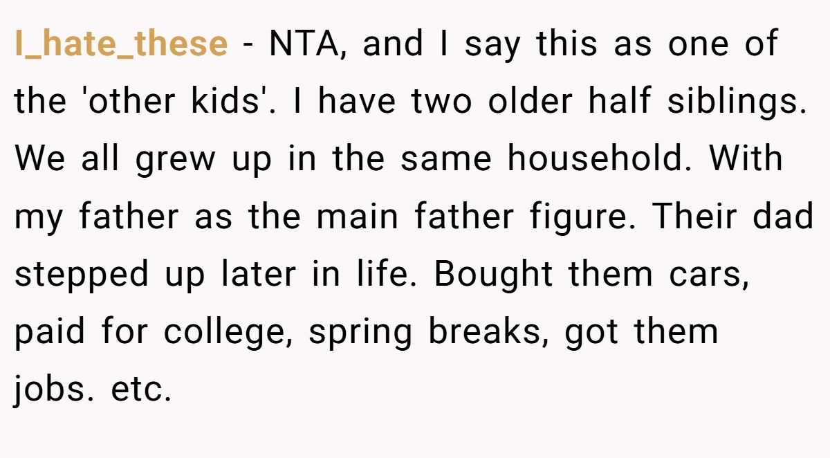 Instead of guilt-tripping the dad, maybe a better path would be open dialogue. Could he encourage his son to be thoughtful toward his siblings? Possibly. But forcing equality between children with different parents doesn’t solve anything. In fact, it might spark even deeper resentment and confusion.