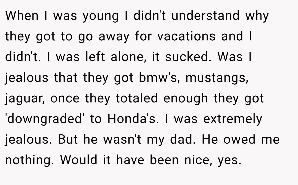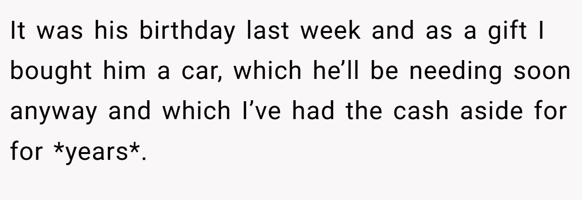 The ex’s frustration seems to stem from comparison. As her household juggles five kids, her son returns from dad’s house wearing nicer clothes, going on trips, and eventually showing up with a new car. For her, it may feel like he’s flaunting it—even if that’s not the intention.