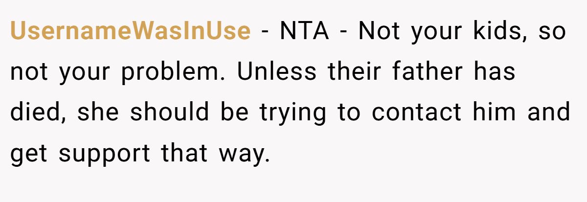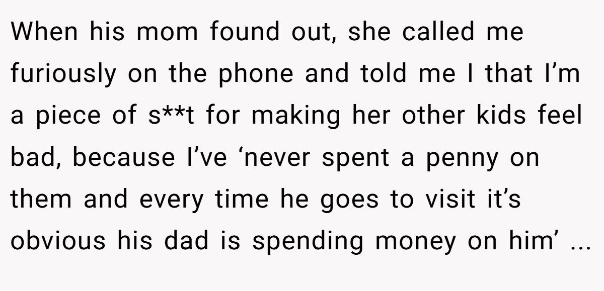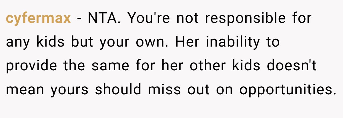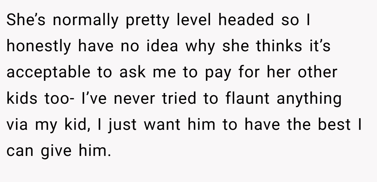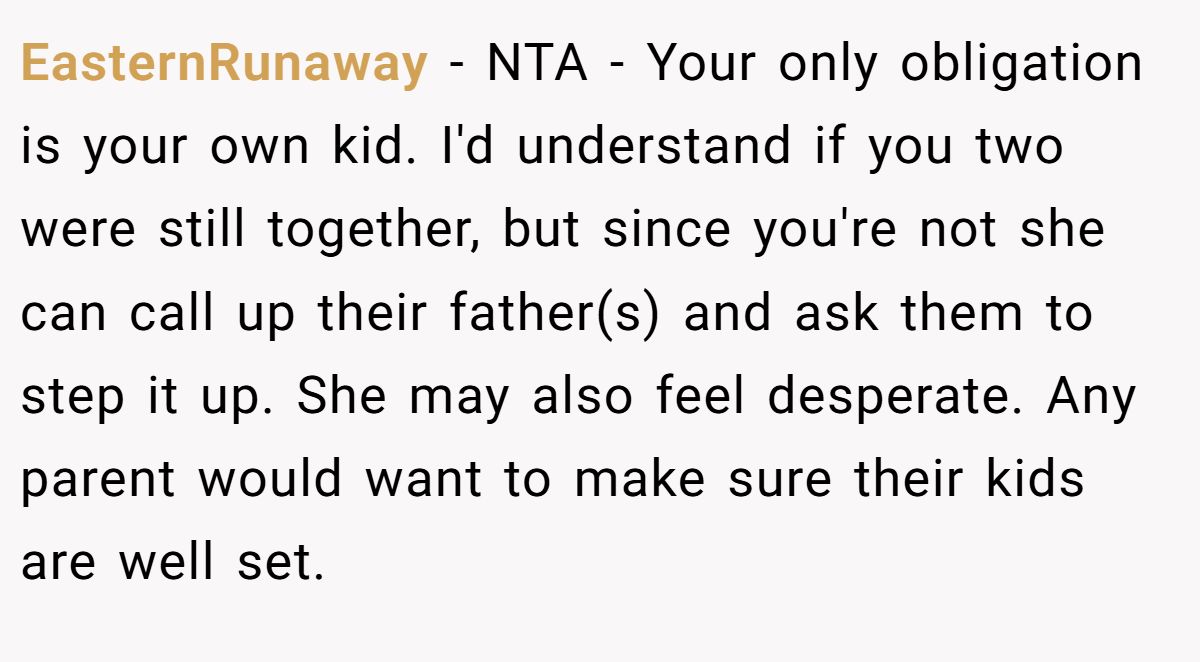 Yes, some stepparents or exes choose to treat all children equally—but choice is not obligation. Her emotional plea sounds more like resentment and jealousy than logic. She’s asking her ex to patch holes caused by her own life choices. As some Redditors noted, if her other kids need support, that’s a conversation for their actual fathers.