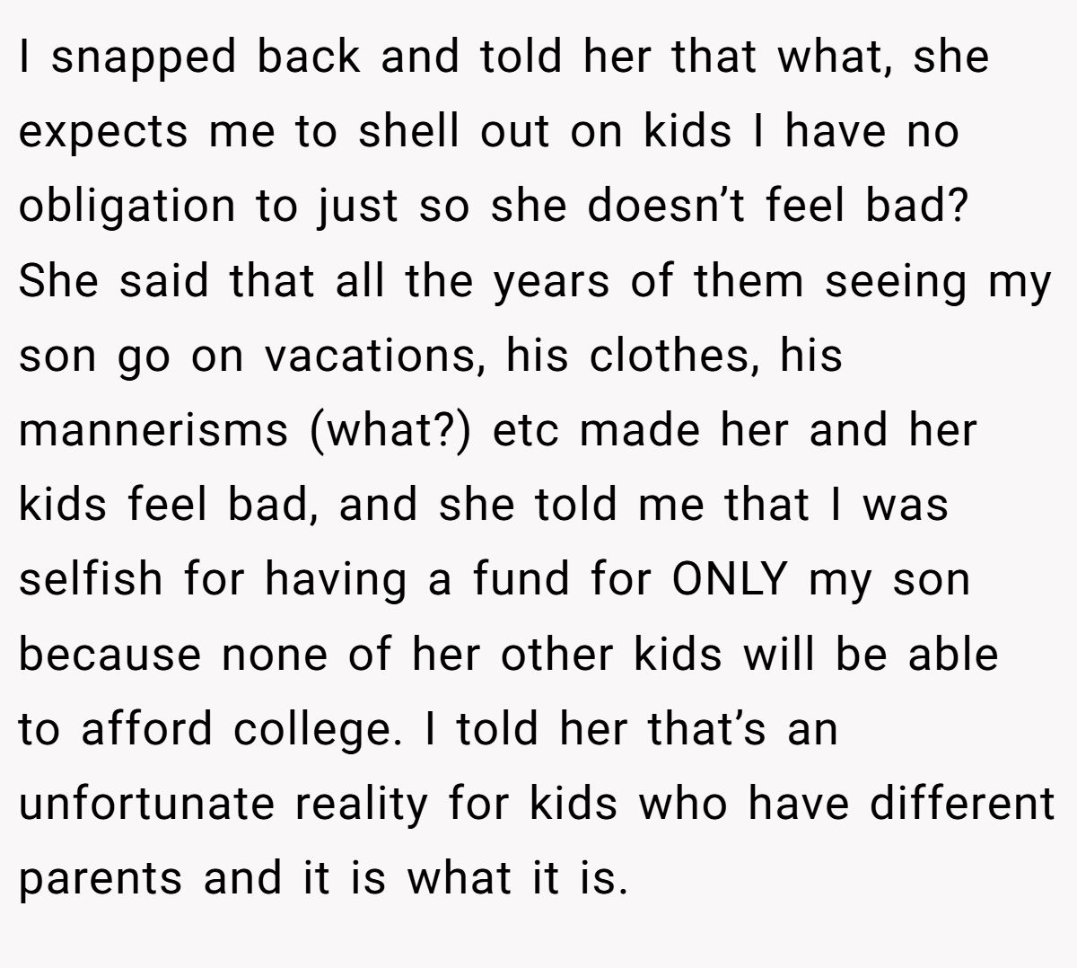 This Redditor’s money drama is wilder than a reality TV spat! Was he right to shut down his ex’s demand to fund her other kids, or should he spread the wealth? His focus on his son’s future is heartfelt, but her resentment’s stirring the pot.