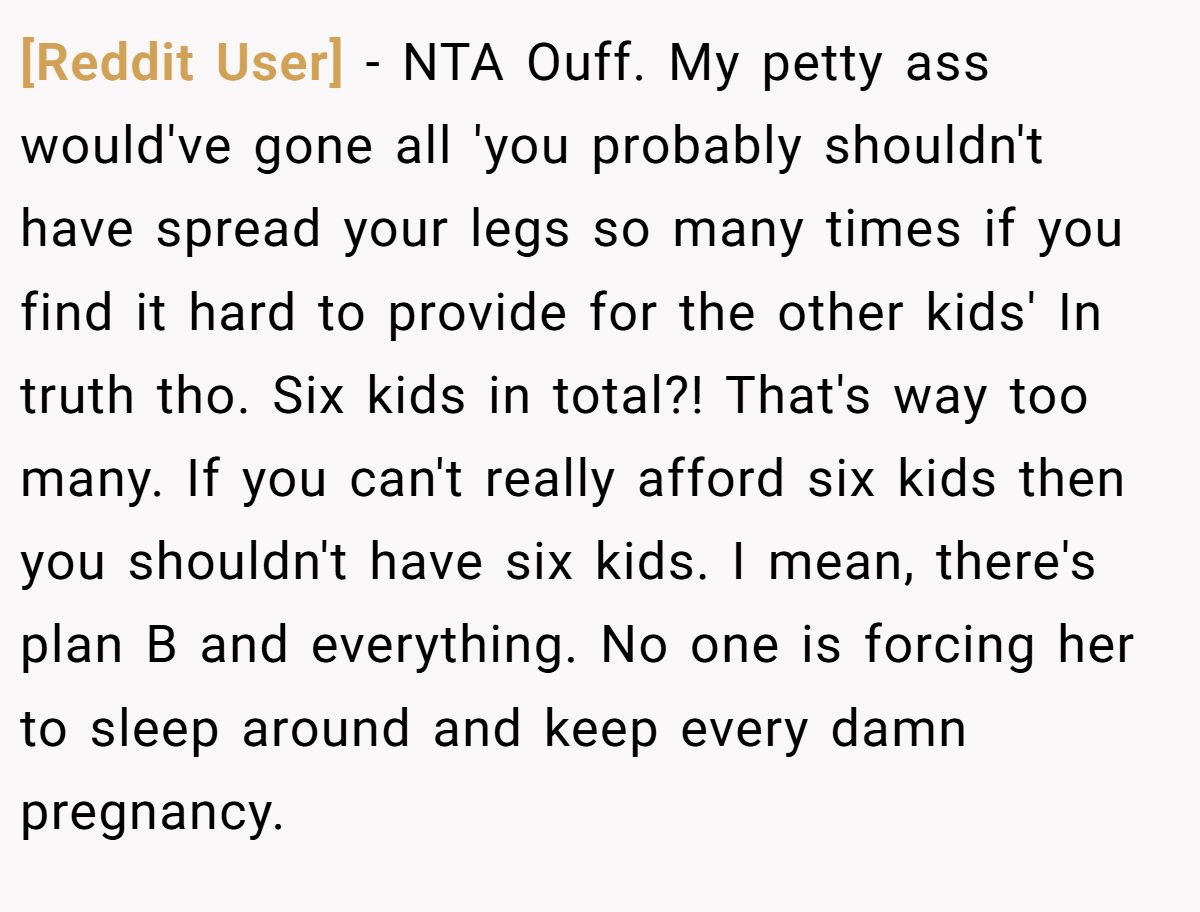 Six kids is too many if she can’t afford them—his son shouldn’t suffer for it.