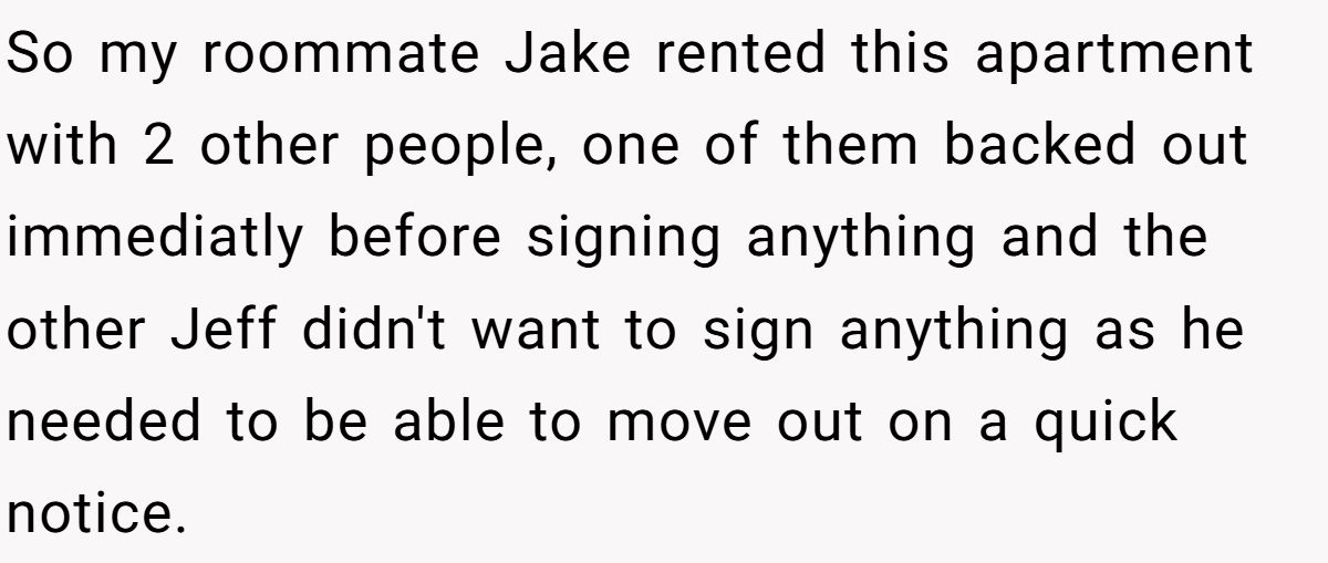 So my roommate Jake rented this apartment with 2 other people, one of them backed out immediatly before signing anything and the other Jeff didn't want to sign anything as he needed to be able to move out on a quick notice.