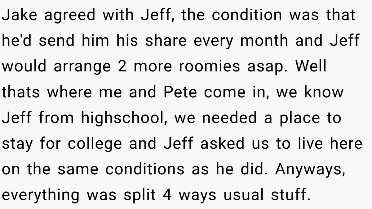 Jake agreed with Jeff, the condition was that he'd send him his share every month and Jeff would arrange 2 more roomies asap. Well thats where me and Pete come in, we know Jeff from highschool, we needed a place to stay for college and Jeff asked us to live here on the same conditions as he did. Anyways, everything was split 4 ways usual stuff.