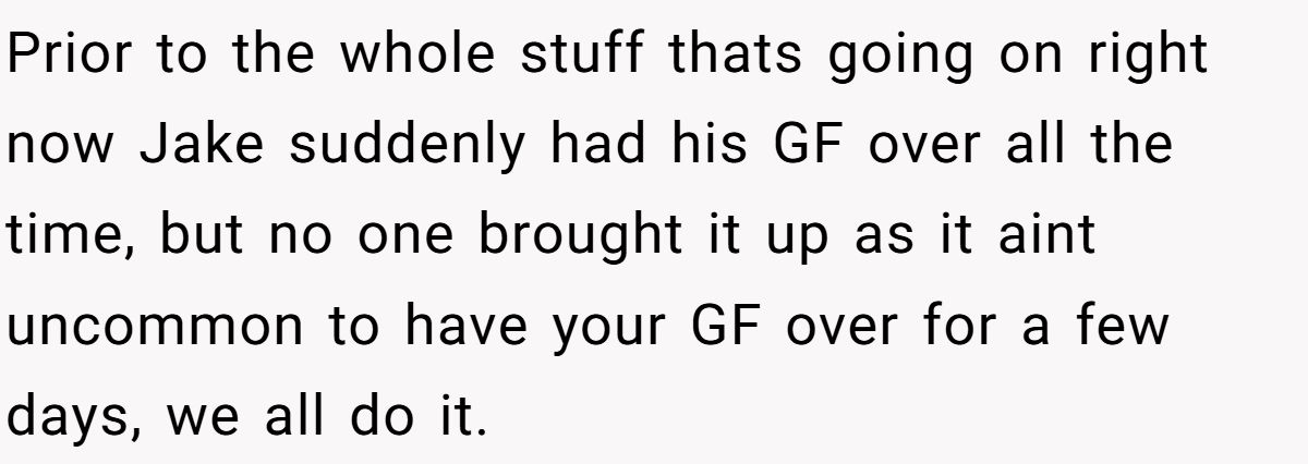 Prior to the whole stuff thats going on right now Jake suddenly had his GF over all the time, but no one brought it up as it aint uncommon to have your GF over for a few days, we all do it.