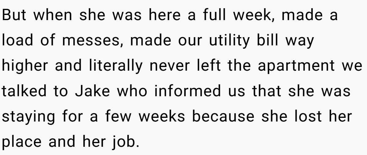 But when she was here a full week, made a load of messes, made our utility bill way higher and literally never left the apartment we talked to Jake who informed us that she was staying for a few weeks because she lost her place and her job.