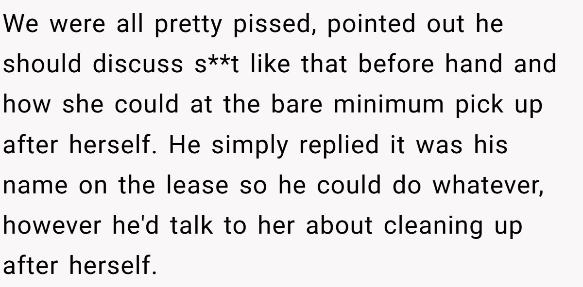 We were all pretty pissed, pointed out he should discuss s**t like that before hand and how she could at the bare minimum pick up after herself. He simply replied it was his name on the lease so he could do whatever, however he'd talk to her about cleaning up after herself.