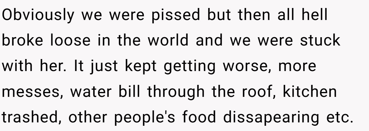 Obviously we were pissed but then all hell broke loose in the world and we were stuck with her. It just kept getting worse, more messes, water bill through the roof, kitchen trashed, other people's food dissapearing etc.