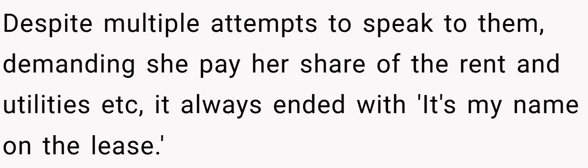 Despite multiple attempts to speak to them, demanding she pay her share of the rent and utilities etc, it always ended with 'It's my name on the lease.'