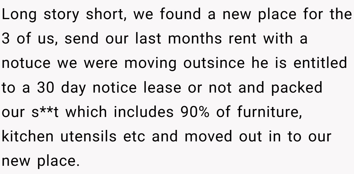 Long story short, we found a new place for the 3 of us, send our last months rent with a notuce we were moving outsince he is entitled to a 30 day notice lease or not and packed our s**t which includes 90% of furniture, kitchen utensils etc and moved out in to our new place.