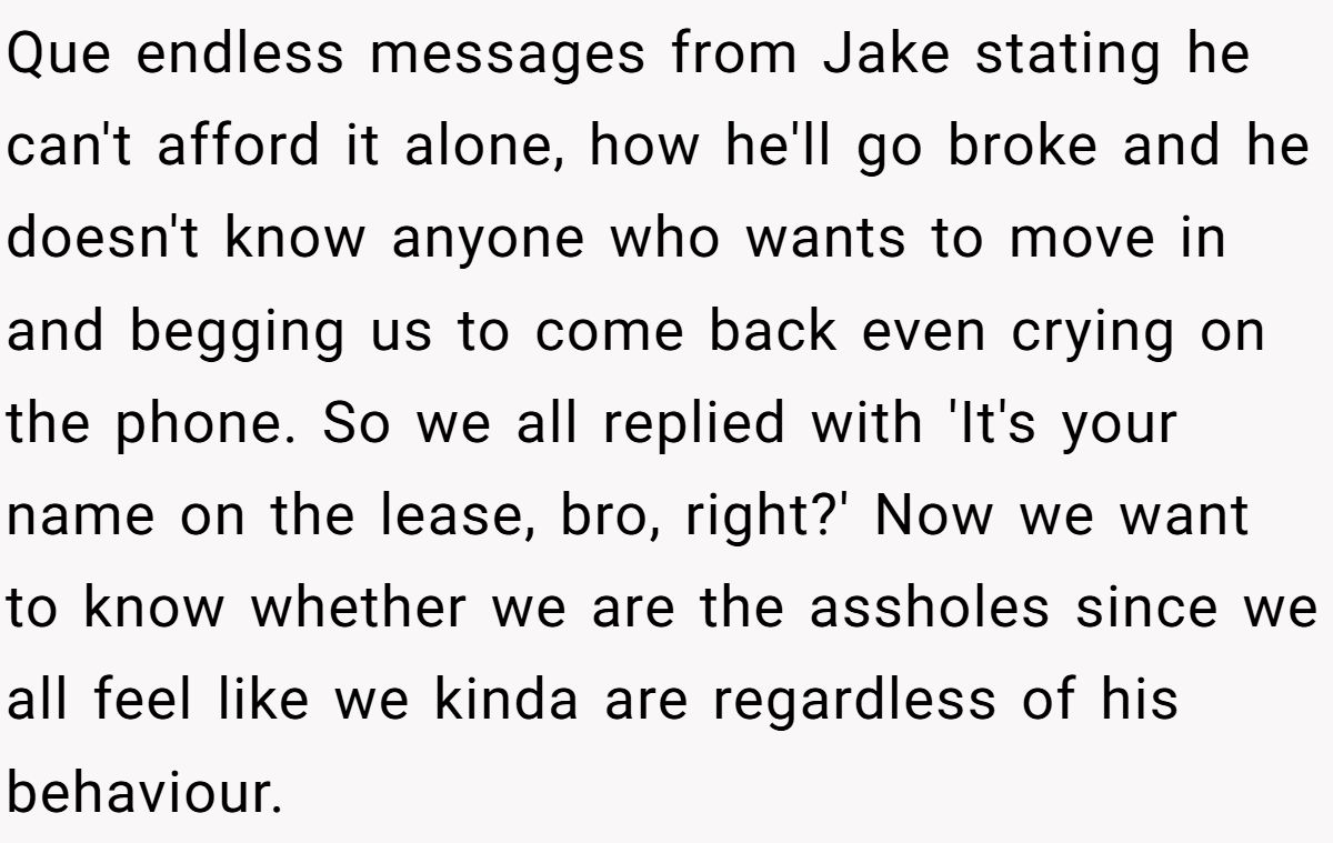 Que endless messages from Jake stating he can't afford it alone, how he'll go broke and he doesn't know anyone who wants to move in and begging us to come back even crying on the phone. So we all replied with 'It's your name on the lease, bro, right?' Now we want to know whether we are the assholes since we all feel like we kinda are regardless of his behaviour.