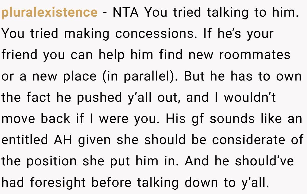 pluralexistence − NTA You tried talking to him. You tried making concessions. If he’s your friend you can help him find new roommates or a new place (in parallel). But he has to own the fact he pushed y’all out, and I wouldn’t move back if I were you. His gf sounds like an entitled AH given she should be considerate of the position she put him in. And he should’ve had foresight before talking down to y’all.