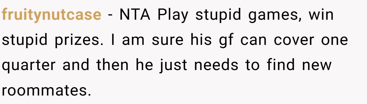 fruitynutcase − NTA Play stupid games, win stupid prizes. I am sure his gf can cover one quarter and then he just needs to find new roommates.