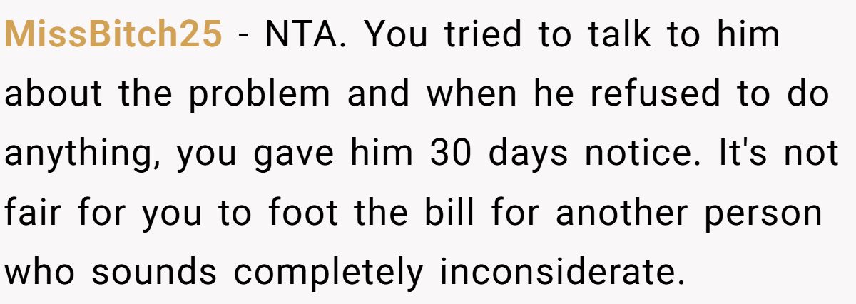 MissBitch25 − NTA. You tried to talk to him about the problem and when he refused to do anything, you gave him 30 days notice. It's not fair for you to foot the bill for another person who sounds completely inconsiderate.