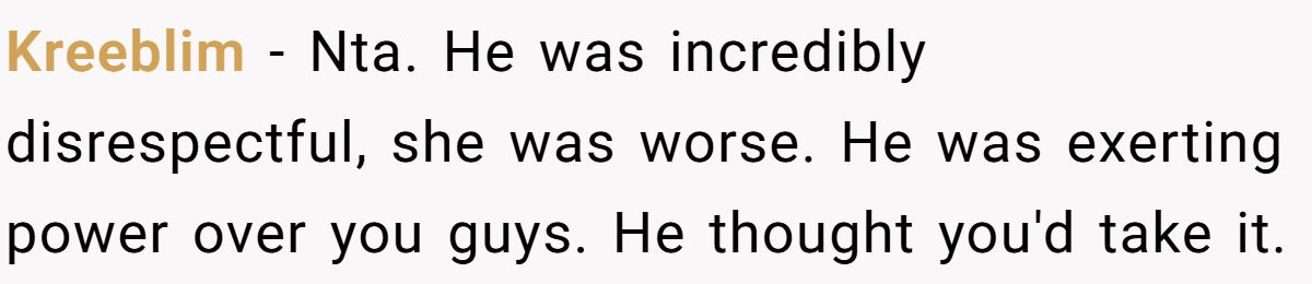 Kreeblim − Nta. He was incredibly disrespectful, she was worse. He was exerting power over you guys. He thought you'd take it.