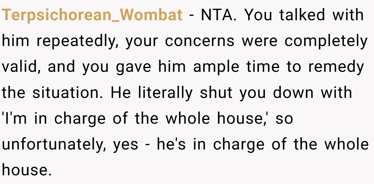 Terpsichorean_Wombat − NTA. You talked with him repeatedly, your concerns were completely valid, and you gave him ample time to remedy the situation. He literally shut you down with 'I'm in charge of the whole house,' so unfortunately, yes - he's in charge of the whole house.