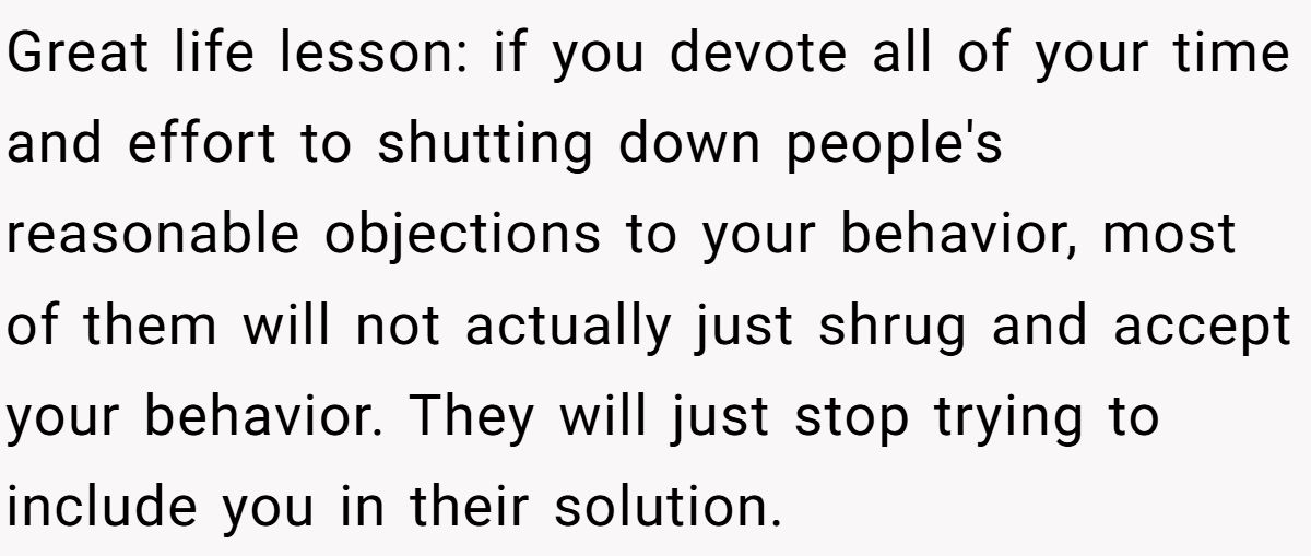 Great life lesson: if you devote all of your time and effort to shutting down people's reasonable objections to your behavior, most of them will not actually just shrug and accept your behavior. They will just stop trying to include you in their solution.