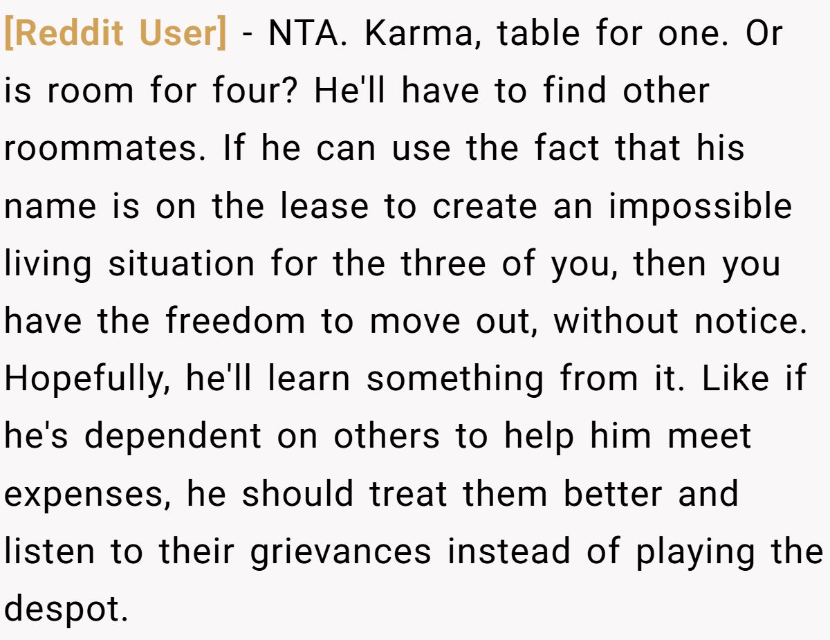 [Reddit User] − NTA. Karma, table for one. Or is room for four? He'll have to find other roommates. If he can use the fact that his name is on the lease to create an impossible living situation for the three of you, then you have the freedom to move out, without notice. Hopefully, he'll learn something from it. Like if he's dependent on others to help him meet expenses, he should treat them better and listen to their grievances instead of playing the despot.