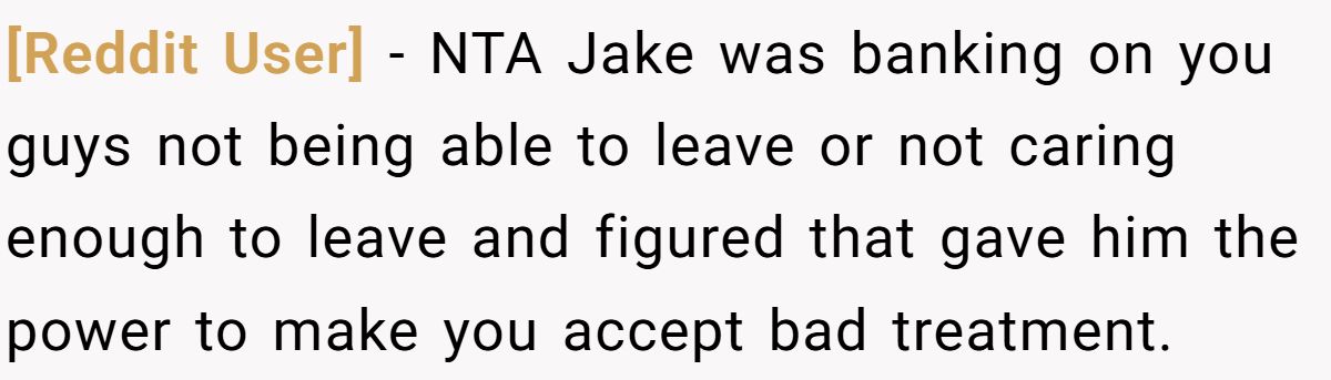 [Reddit User] − NTA Jake was banking on you guys not being able to leave or not caring enough to leave and figured that gave him the power to make you accept bad treatment.