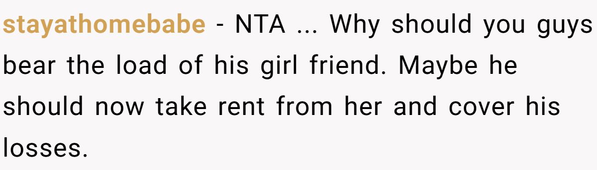 stayathomebabe − NTA ... Why should you guys bear the load of his girl friend. Maybe he should now take rent from her and cover his losses.