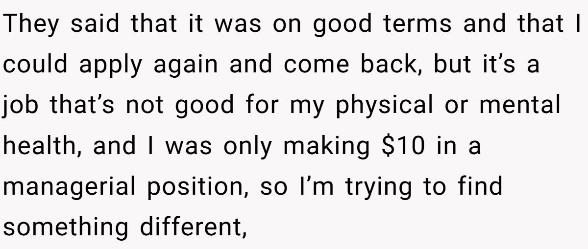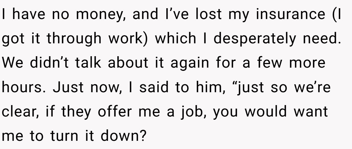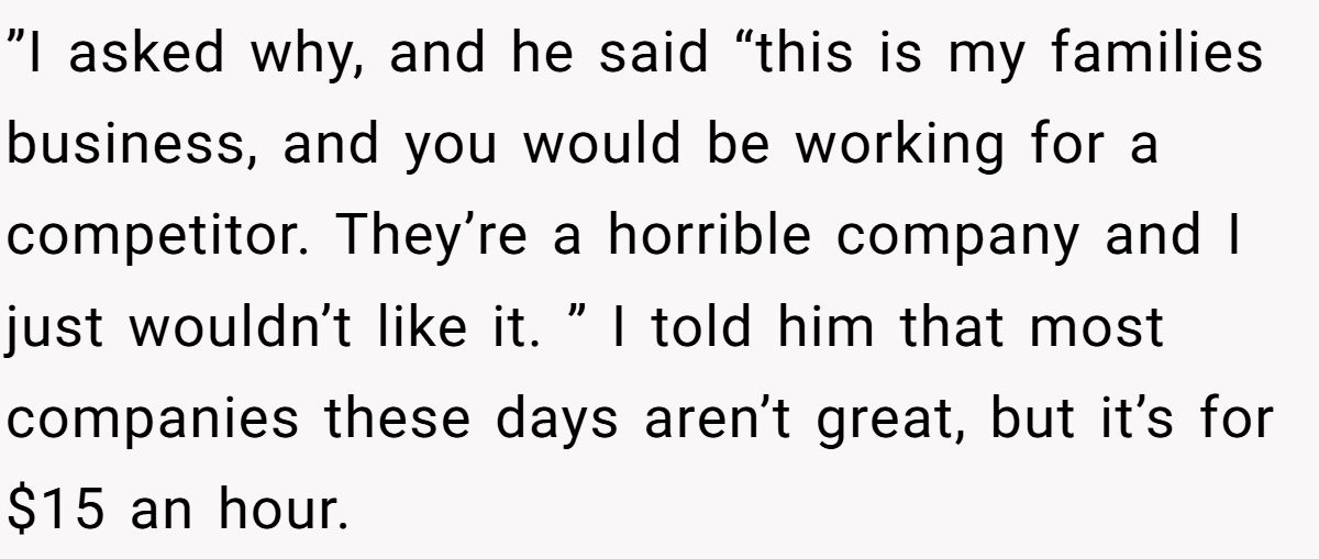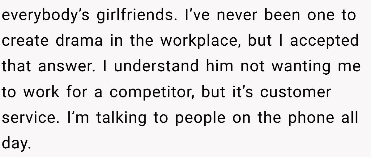 She tried to explain that it was just a customer service role, nothing to do with strategy or trade secrets. But he wouldn’t hear it. He called the company “horrible,” accused her of betrayal, and demanded she withdraw the application.