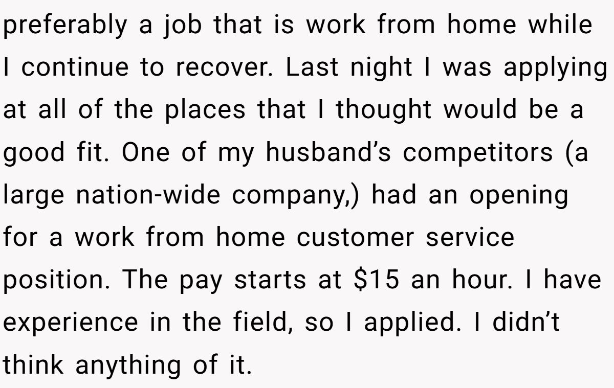 Her last job at a bookstore had barely paid enough to scrape by. Now, with no health insurance and her savings evaporating, she felt desperation creeping in like a slow leak. When she spotted the work-from-home position at a national competitor of her husband’s family business, she hesitated only a moment before submitting her resume.