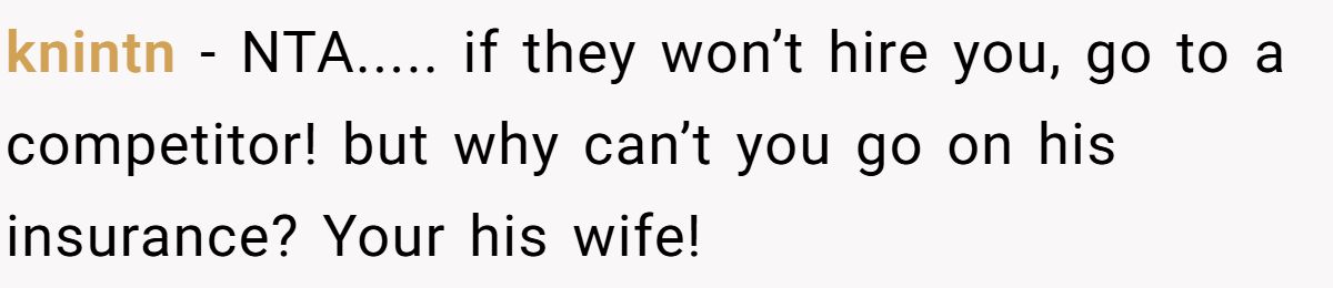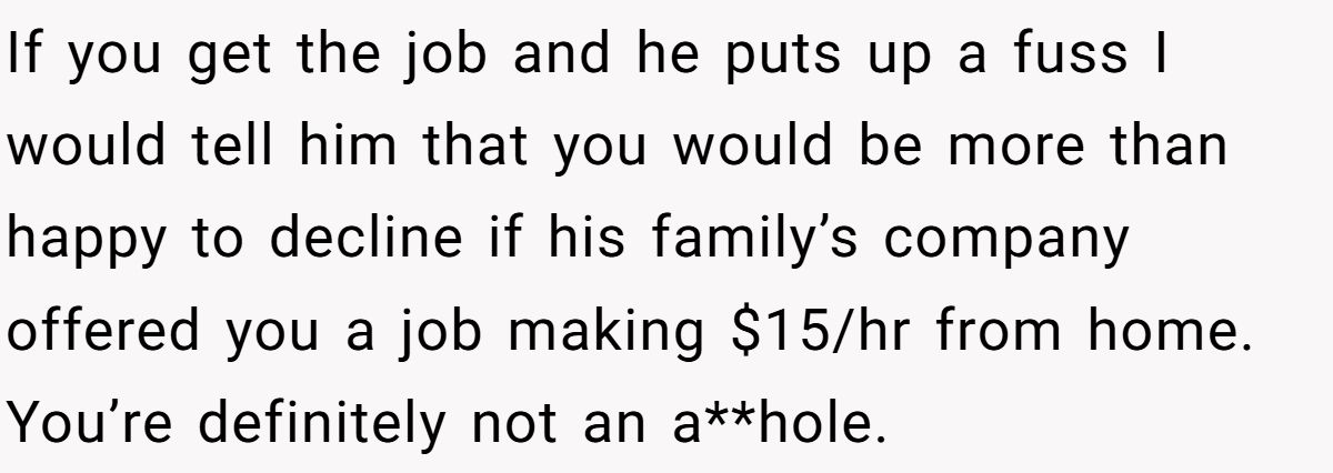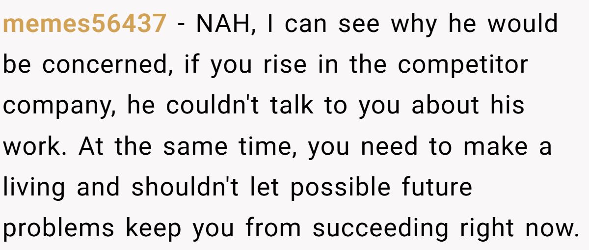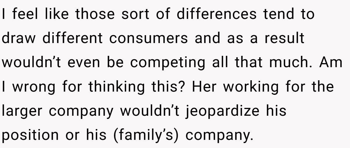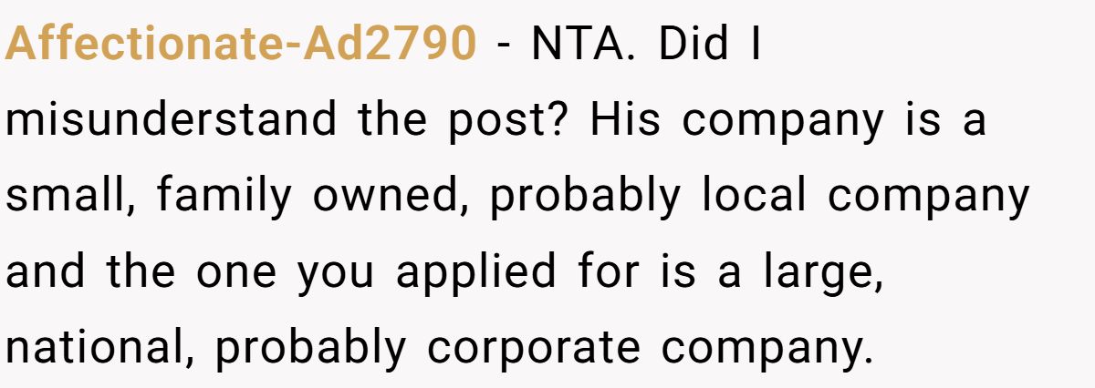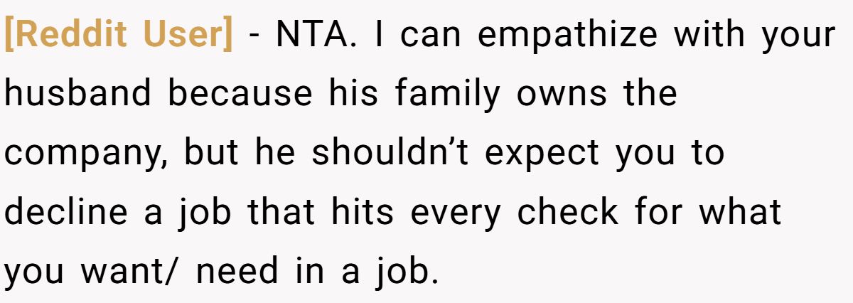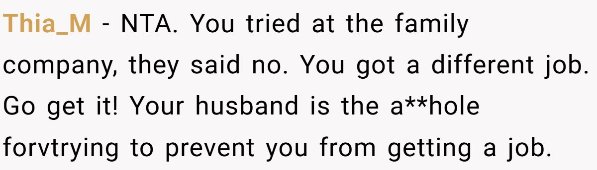 Commenters backed OP, saying NTA. They argued her husband’s worries were overblown, his family’s small business and her potential job at a big corporation wouldn’t truly compete.