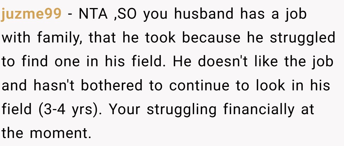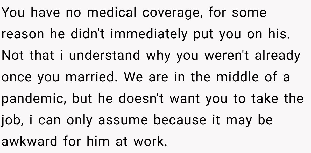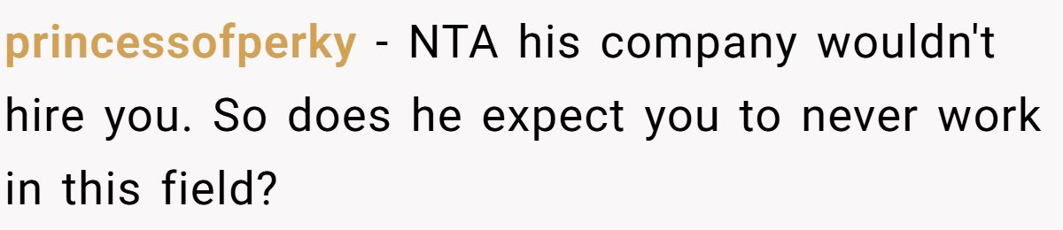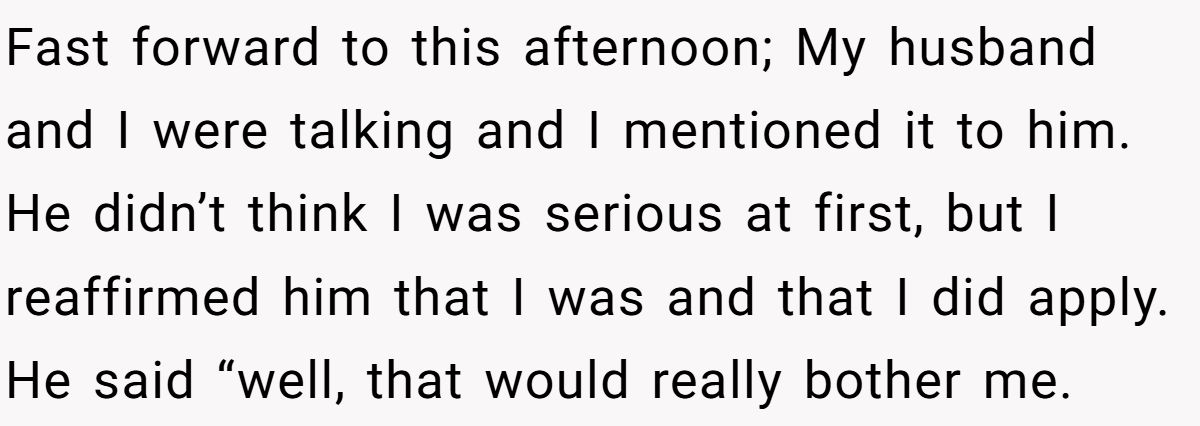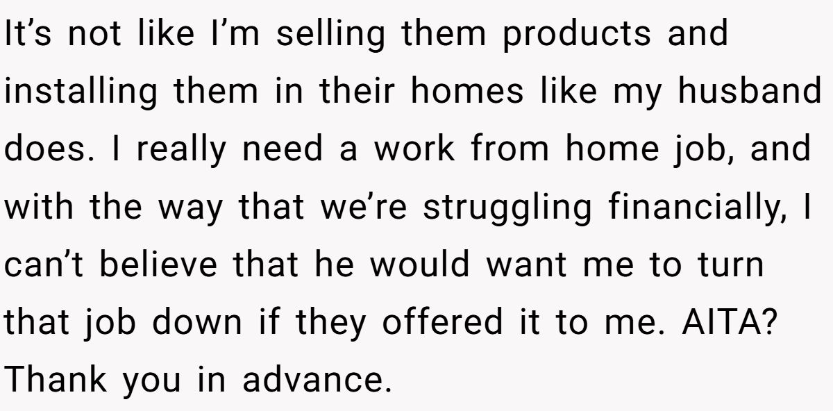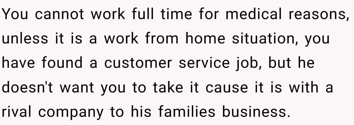 Commenters backed OP, saying NTA. They argued her husband’s worries were overblown, his family’s small business and her potential job at a big corporation wouldn’t truly compete.