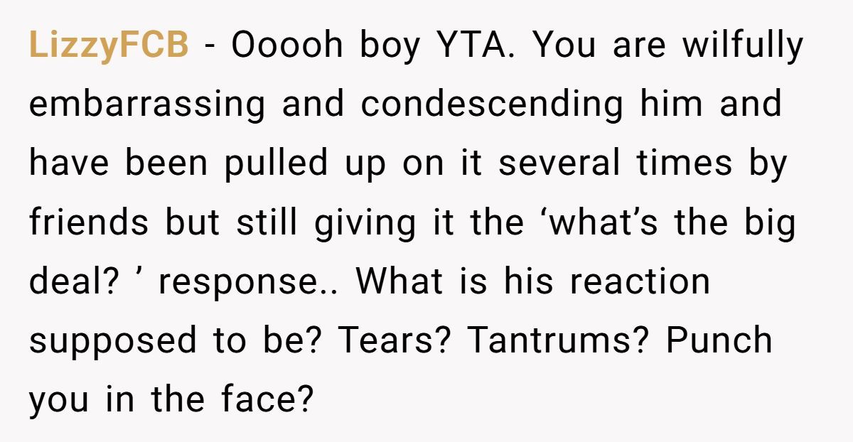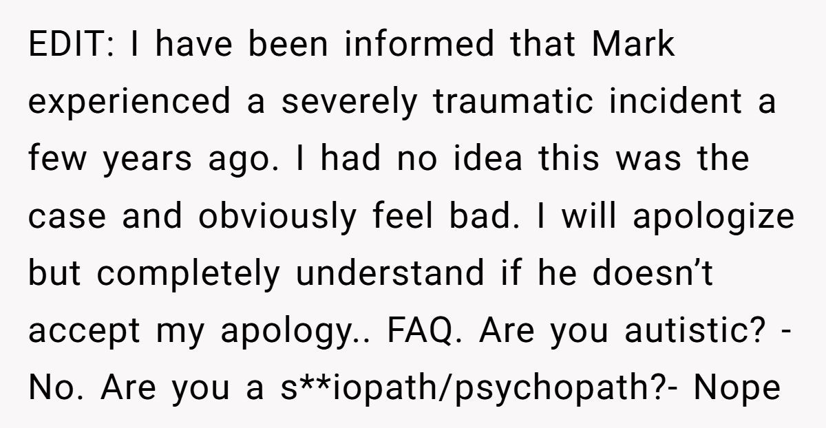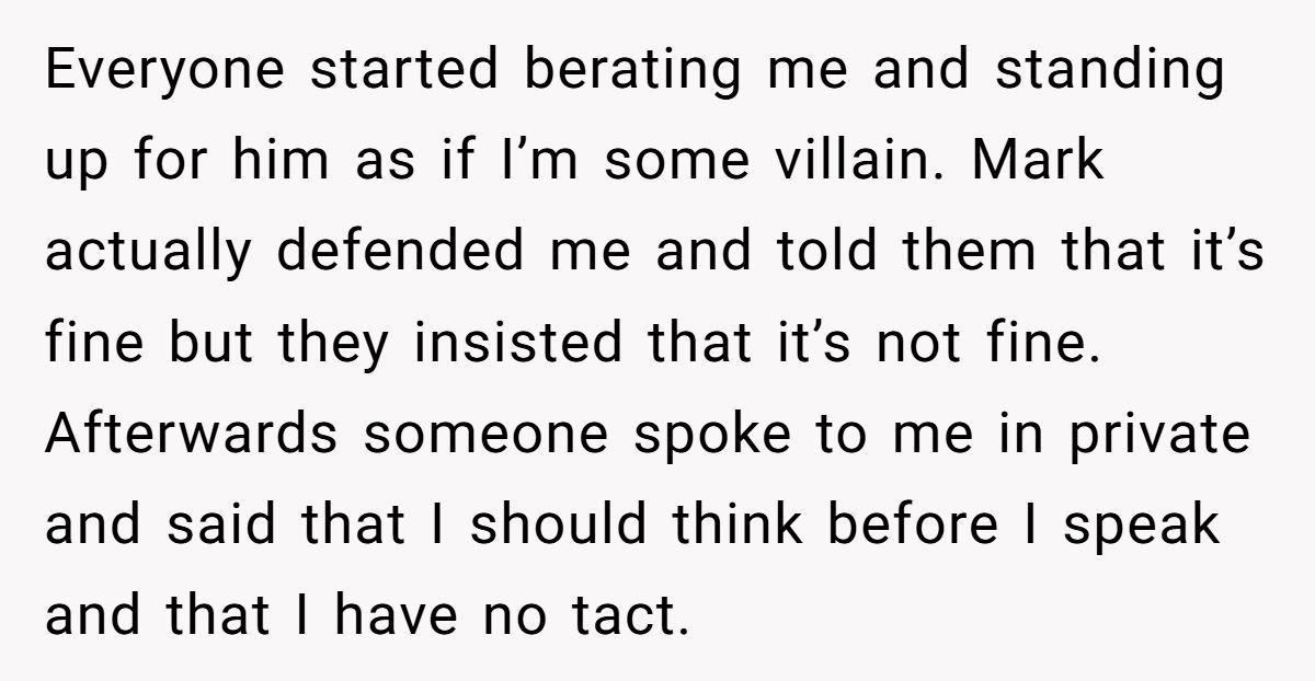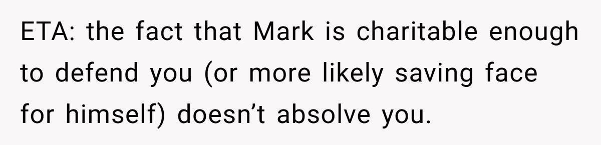 Mark defended her in the moment, probably to save face or keep the peace. But that doesn’t mean he wasn’t hurt. The Redditor’s later realization and edit show she’s starting to understand, but healing this rift will take more than an apology. A real conversation, one that centers on Mark’s feelings and not her guilt, might be the only way forward.