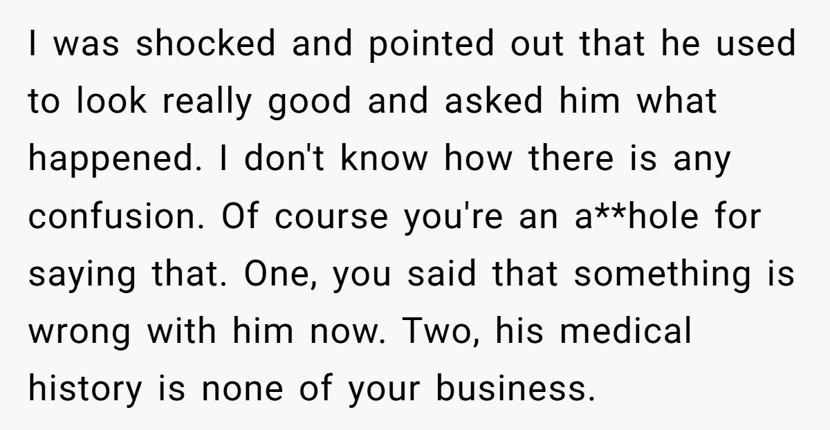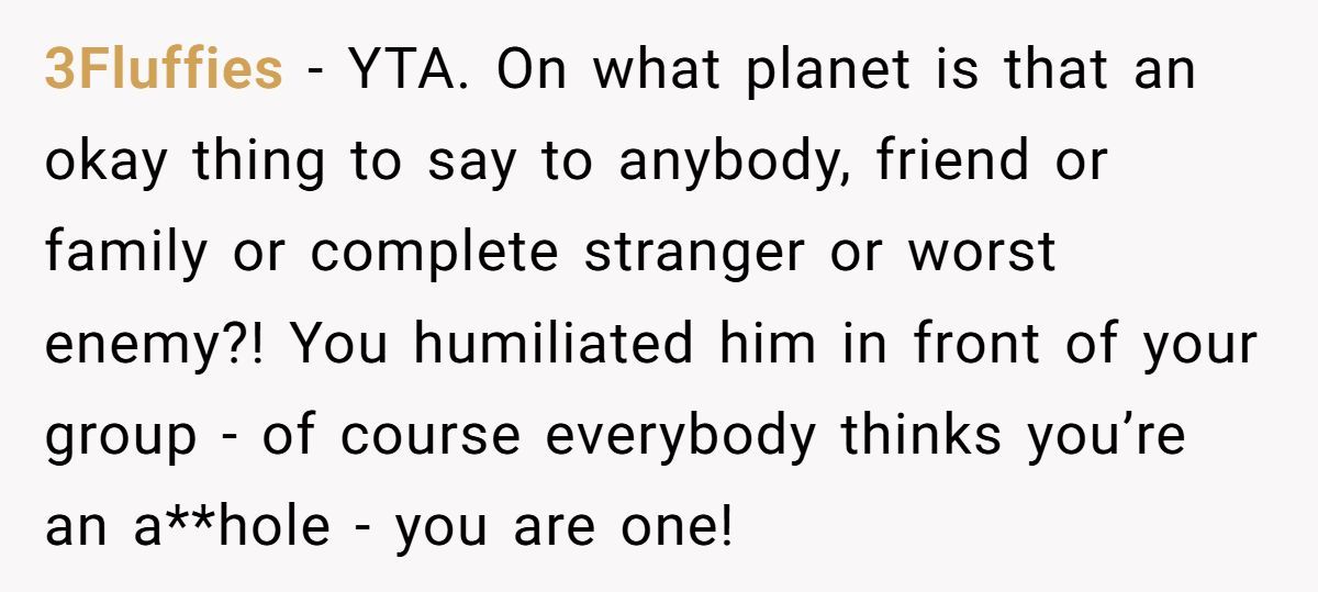 Redditors agreed he was the AH. He embarrassed his friend with rude comments about his appearance. Even if the friend didn’t protest, most felt he was just being polite.