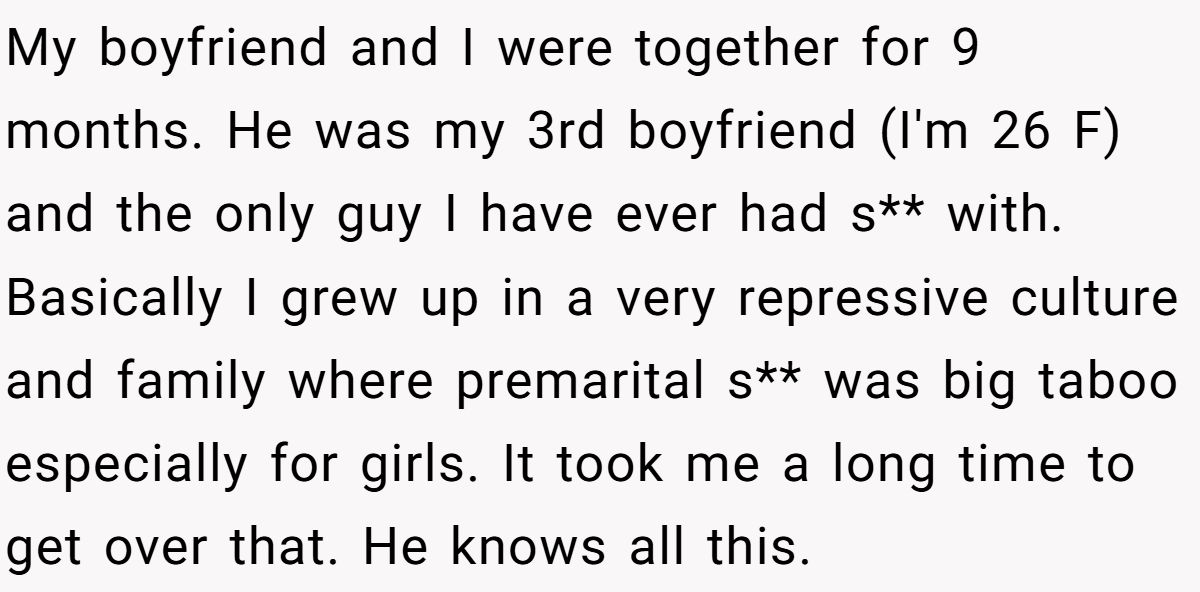 My boyfriend and I were together for 9 months. He was my 3rd boyfriend (I'm 26 F) and the only guy I have ever had s** with. Basically I grew up in a very repressive culture and family where premarital s** was big taboo especially for girls. It took me a long time to get over that. He knows all this.
