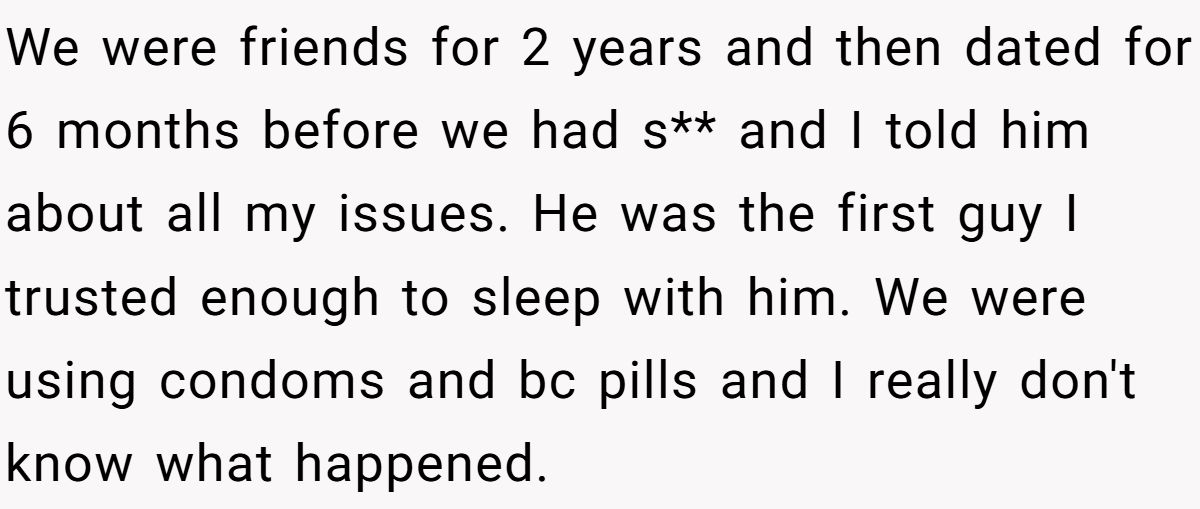 We were friends for 2 years and then dated for 6 months before we had s** and I told him about all my issues. He was the first guy I trusted enough to sleep with him. We were using condoms and bc pills and I really don't know what happened.