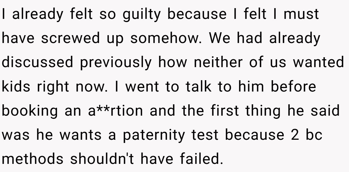 I already felt so guilty because I felt I must have screwed up somehow. We had already discussed previously how neither of us wanted kids right now. I went to talk to him before booking an a**rtion and the first thing he said was he wants a paternity test because 2 bc methods shouldn't have failed.