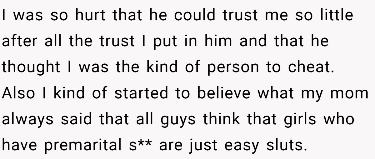 I was so hurt that he could trust me so little after all the trust I put in him and that he thought I was the kind of person to cheat. Also I kind of started to believe what my mom always said that all guys think that girls who have premarital s** are just easy sluts.
