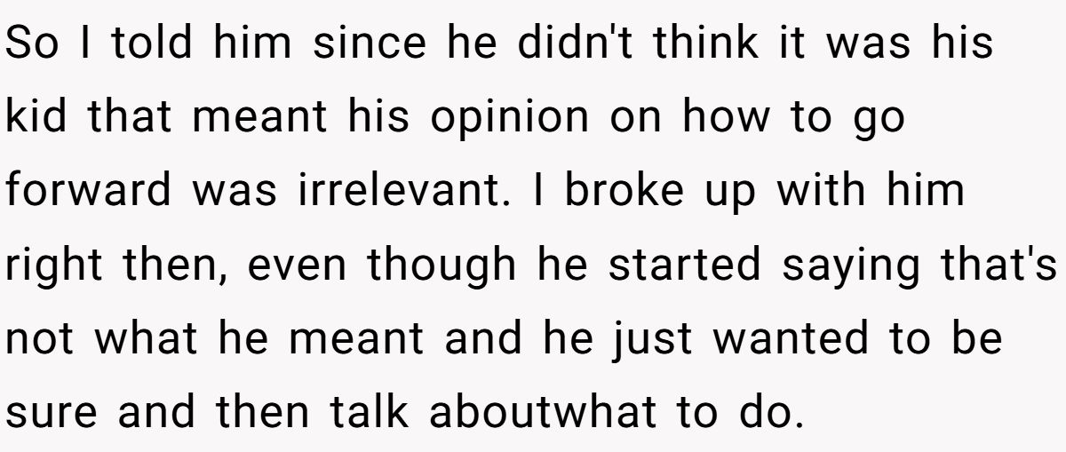 So I told him since he didn't think it was his kid that meant his opinion on how to go forward was irrelevant. I broke up with him right then, even though he started saying that's not what he meant and he just wanted to be sure and then talk aboutwhat to do.