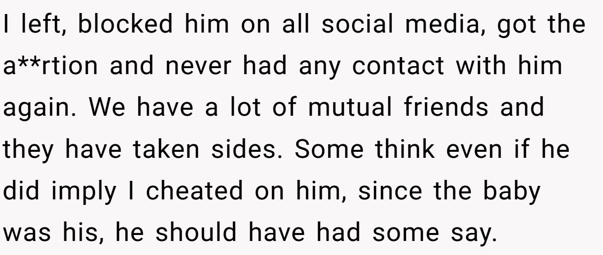 I left, blocked him on all social media, got the a**rtion and never had any contact with him again. We have a lot of mutual friends and they have taken sides. Some think even if he did imply I cheated on him, since the baby was his, he should have had some say.