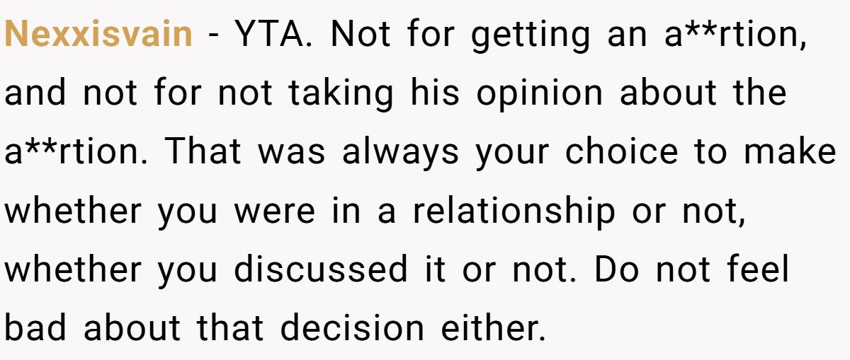 Nexxisvain − YTA. Not for getting an a**rtion, and not for not taking his opinion about the a**rtion. That was always your choice to make whether you were in a relationship or not, whether you discussed it or not. Do not feel bad about that decision either.
