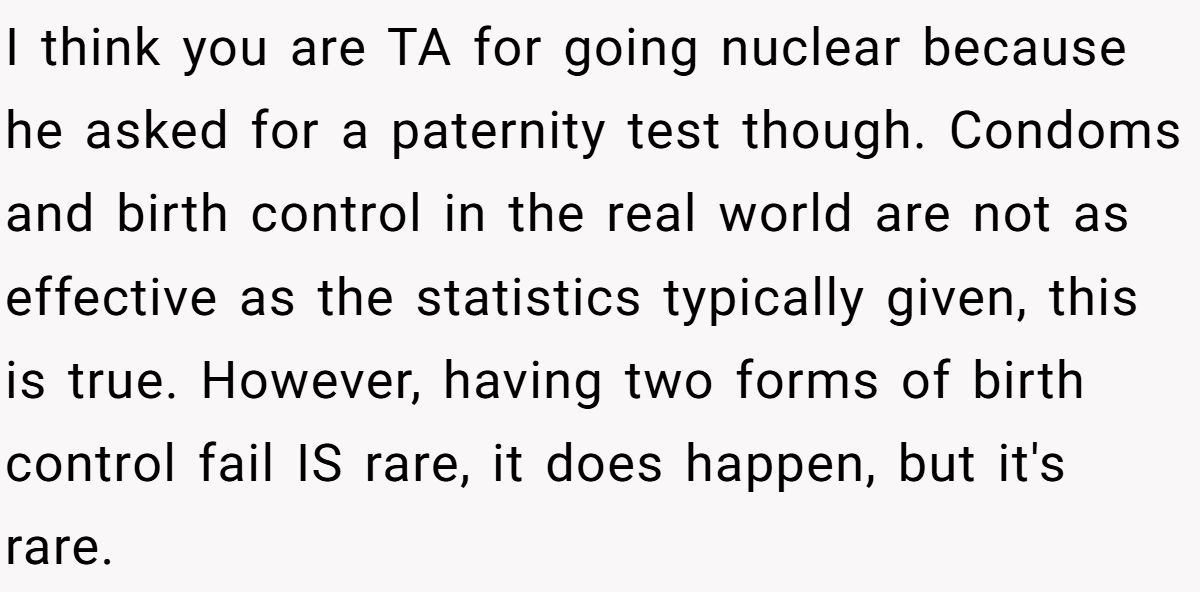 I think you are TA for going nuclear because he asked for a paternity test though. Condoms and birth control in the real world are not as effective as the statistics typically given, this is true. However, having two forms of birth control fail IS rare, it does happen, but it's rare.