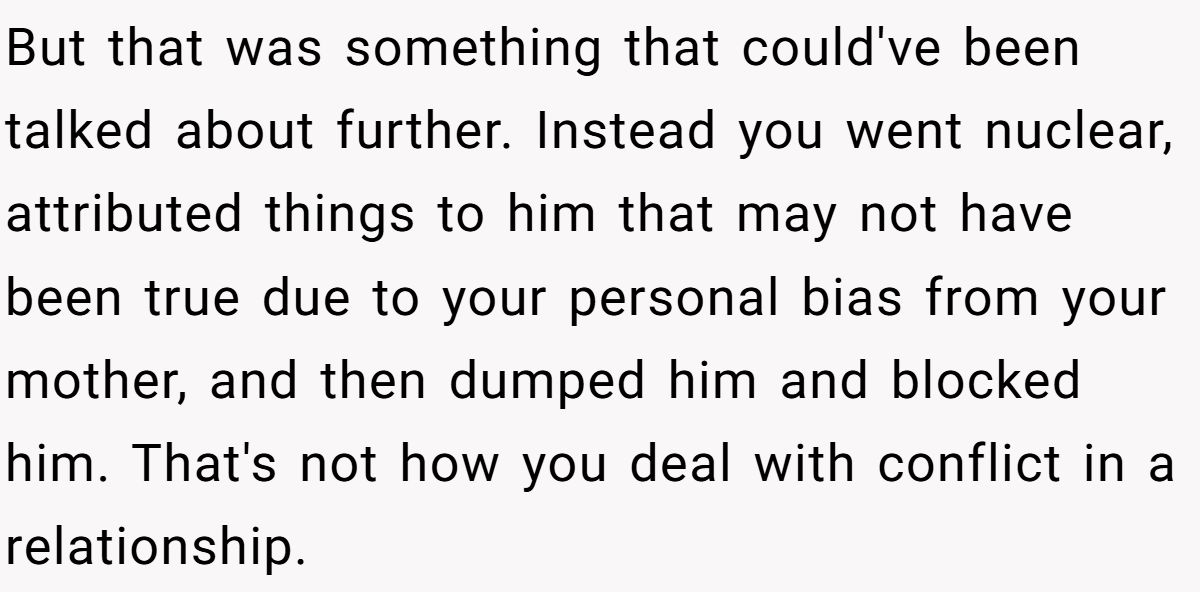 But that was something that could've been talked about further. Instead you went nuclear, attributed things to him that may not have been true due to your personal bias from your mother, and then dumped him and blocked him. That's not how you deal with conflict in a relationship.