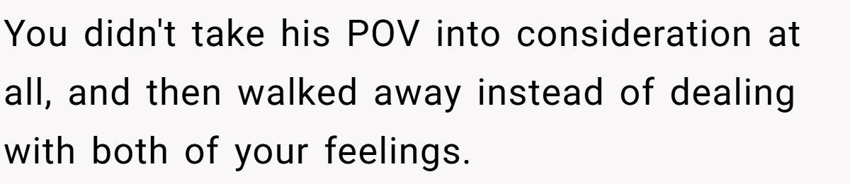 You didn't take his POV into consideration at all, and then walked away instead of dealing with both of your feelings.