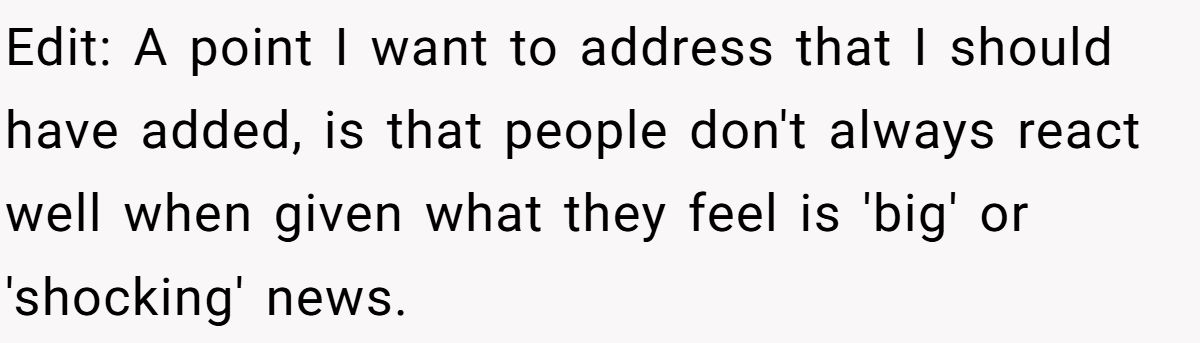 Edit: A point I want to address that I should have added, is that people don't always react well when given what they feel is 'big' or 'shocking' news.