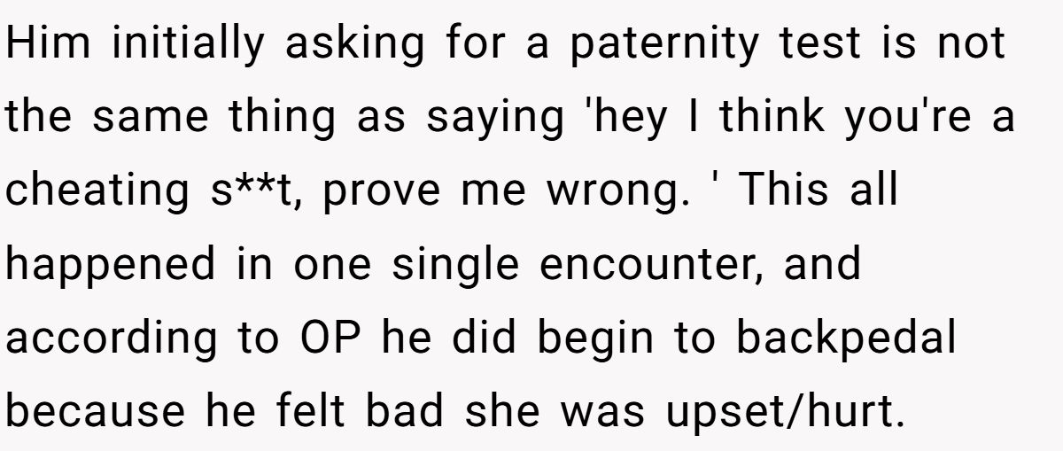 Him initially asking for a paternity test is not the same thing as saying 'hey I think you're a cheating s**t, prove me wrong. ' This all happened in one single encounter, and according to OP he did begin to backpedal because he felt bad she was upset/hurt.